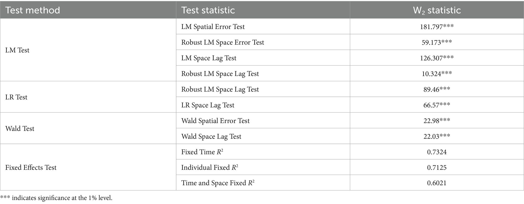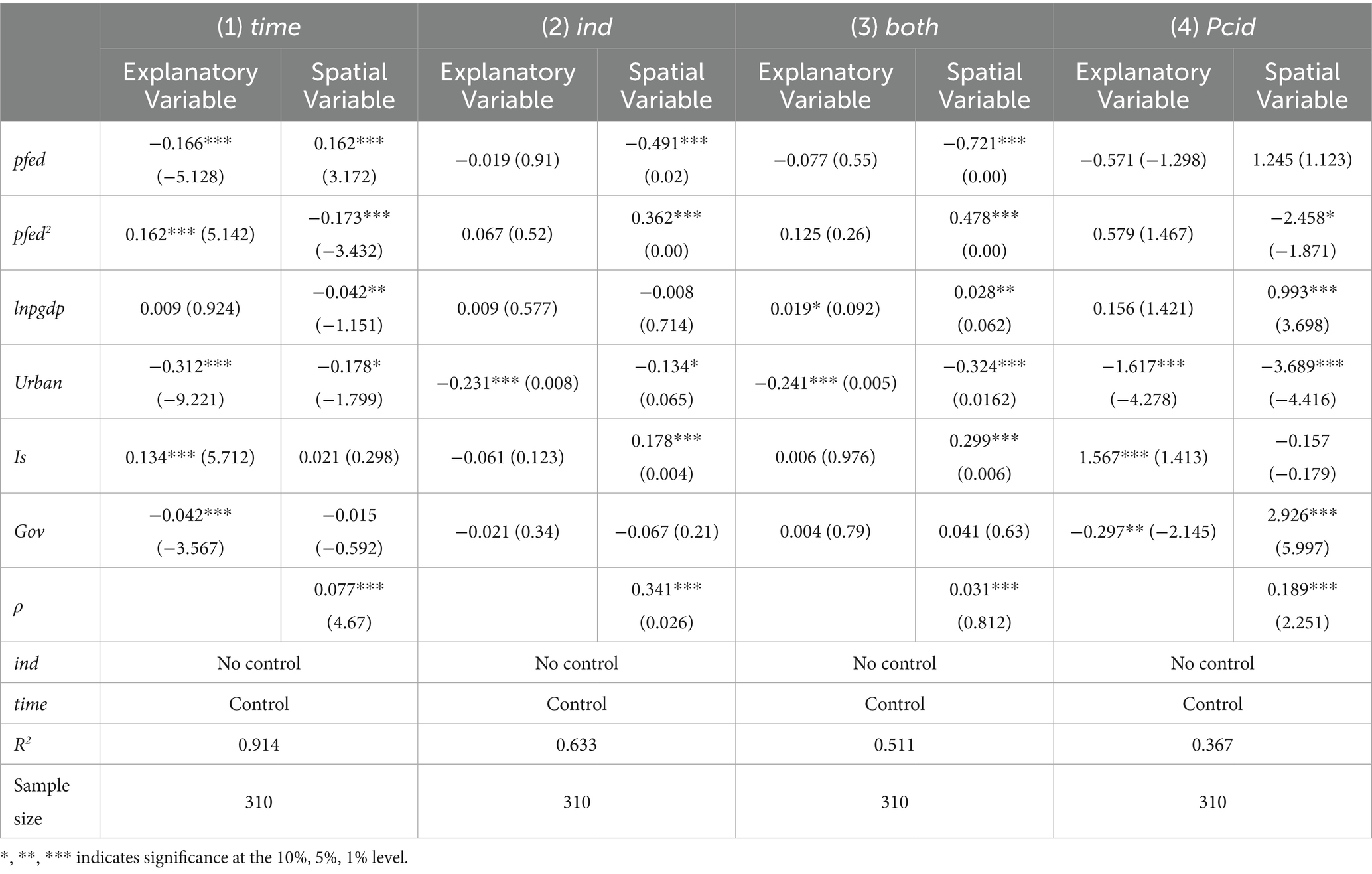 As shown above, there is spatial correlation between the urban–rural income gaps of each province, so a spatial weight matrix is introduced into the model. Spatial econometric models need to be selected for estimation to make the estimation results more accurate. Table 4 presents a series of test results for spatial econometric models. The results show that the p-values of the LM test and the robust LM test all pass the 1% significance level, indicating the presence of spatial error effects and spatial lag effects, and the spatial Durbin model is initially selected. The test statistics of the LR test and the Wald test both pass the 1% significance level, indicating that the initially selected spatial Durbin model will not degenerate into a spatial lag model and a spatial error model. Therefore, this paper selects the spatial Durbin model for subsequent empirical analysis. In addition, the result of the Hausman test is negative. Referring to the simulation analysis results of existing studies, it is known that the main reason is that the asymptotic assumptions of the basic assumptions of the random effects model cannot be satisfied. Therefore, when the test value is negative, a fixed-effects model should be chosen. By comparing the adjusted R2 of the fixed-effects model, it is found that the adjusted R2 of the time-fixed-effects model is larger. Therefore, the time-fixed-effects SDM is finally chosen for empirical analysis (Ling et al., 2014).
