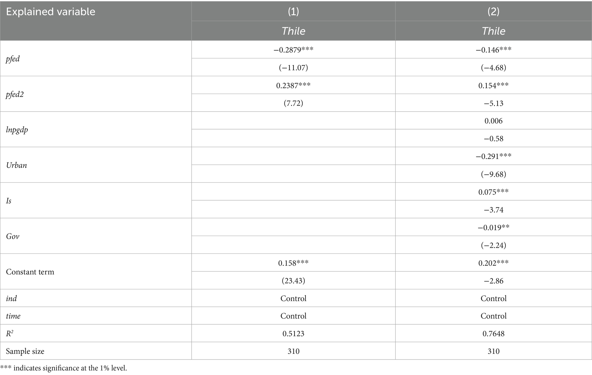 Table 5 presents the benchmark regression results for platform economy development and urban–rural income gap. Column (1) includes the core explanatory variables’ linear and quadratic terms. Column (2) adds control variables. In Column (1), pfed is negative and significant at 1%, while pfed2 is positive and significant at 1%, indicating a “U”-shaped relationship. Column (2) confirms this with significant coefficients. Platform economy initially narrows the income gap but widens it later. This is because digital economy boosts rural economic development and income, but as platform economy evolves, employment polarization worsens, and the income gap increases. The inflection point of the “U”-shaped curve is estimated at a platform economy development level of 0.4637. Descriptive statistics show the average and median platform economy development levels of Chinese provinces are 0.1908 and 0.1213, below the inflection point. Most provinces are to the left of the inflection point and need to boost platform economy development to reduce income gaps. This verifies Hypothesis 1.