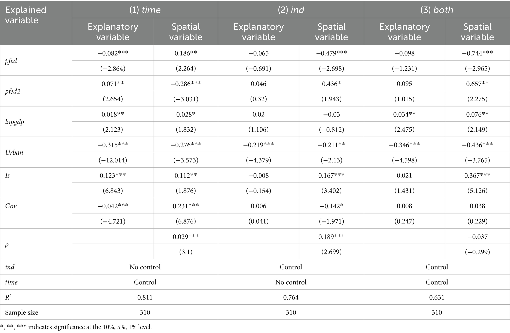 Based on the characteristics of spatial econometric analysis, this paper first chooses to replace the spatial weight matrix for robustness testing, with results shown in Table 9. Columns (1)–(3) present regression results using a contiguity matrix as the replacement, where the time-fixed-effects model fits well, yielding significant results with coefficients and spatial spillover effects of pfed and pfed2 matching those in Column (2) of Table 6. Next, the dependent variable is replaced with the urban–rural disposable income ratio (Pcid), calculated as the ratio of urban to rural disposable income. Regression results in Column (4) of Table 9 show the spatial spillover effect coefficient of pfed2 remains significant with the same sign, confirming the robustness of the original regression results (Fei et al., 2022).