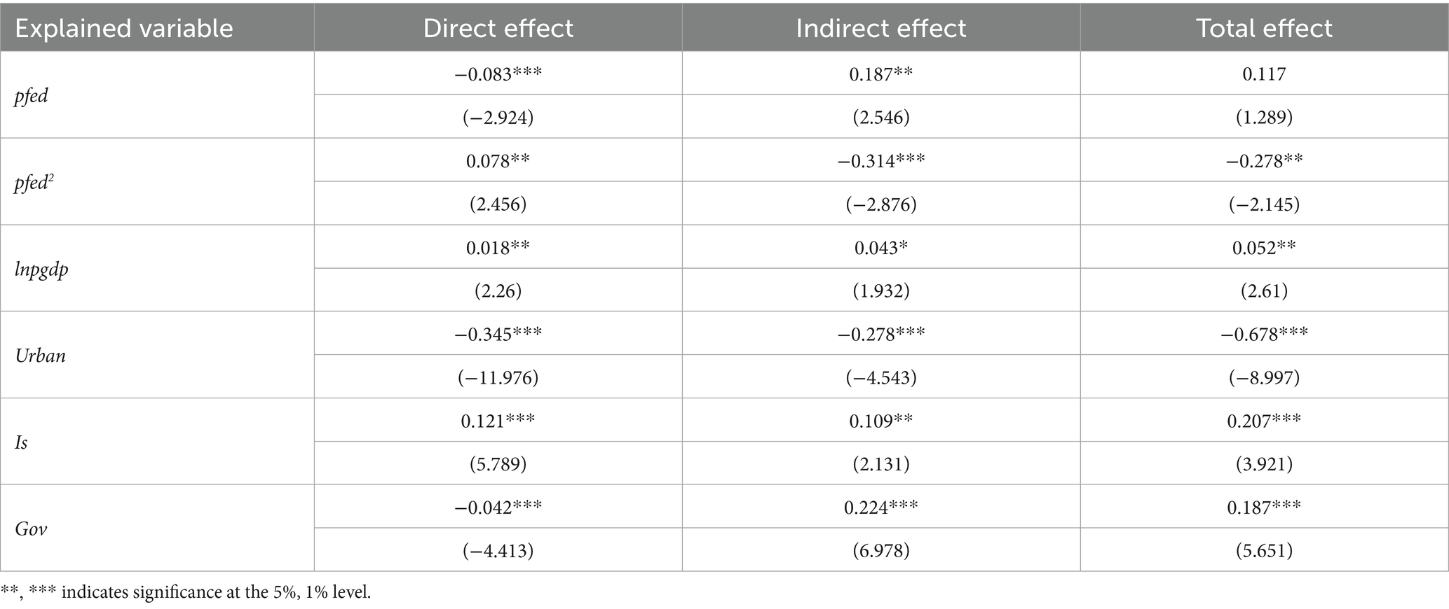 By introducing the spatial matrix for spatial econometric analysis, the results in columns (1)–(3) of Table 6 show that the spatial autoregressive model ρ of the fixed-effects model is significantly positive at the 1% level, indicating the rationality of incorporating spatial factors into the model. The spatial spillover coefficients of the time-fixed-effects, province-fixed-effects, and double-fixed-effects models mostly pass the 5% significance level. In the fixed-effects model, pfed, the core explanatory variable, has a negative coefficient that passes the 1% significance test, indicating reliable model specification and that platform economy development narrows the urban–rural income gap. Its spatial spillover coefficient is significantly positive at the 5% level, showing a positive spatial spillover effect. That is, a higher level of platform economy development in one province tends to widen the urban–rural income gap in neighboring provinces. This may be due to the province’s vigorous development of the platform economy attracting the inflow of production factors such as talent, capital, and technology from adjacent provinces, creating a suction effect, and thus exacerbating the urban–rural income gap in neighboring provinces. The spatial spillover coefficient of pfed2 is about −0.286, indicating that the platform economy development level in other provinces affects the local urban–rural income gap by approximately −28.6%. In summary, both the ordinary panel regression and spatial econometric regression results confirm Hypothesis 1.