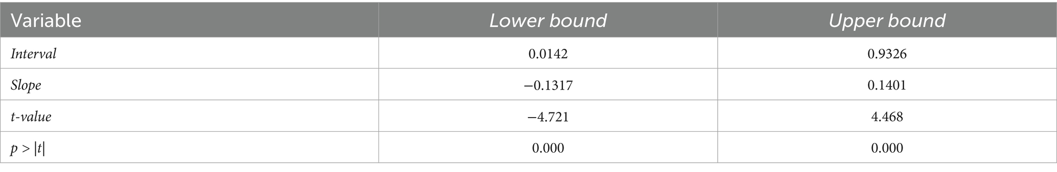 Scholars typically incorporate a nonlinear (usually quadratic) term into a standard linear regression model. If this term is significant and the estimated extremum lies within the data range, a “U”-shaped relationship is considered to exist. However, Lind and Mehlum (2010) deem this criterion too weak. Haans et al. (2016) also point out that a significant quadratic term alone does not fully confirm an (inverted) U-shaped relationship. Thus, it’s necessary to test for inverted U-shaped relationships. This paper tests the relationship between platform economy development and the urban–rural income gap, with results shown in Table 8.