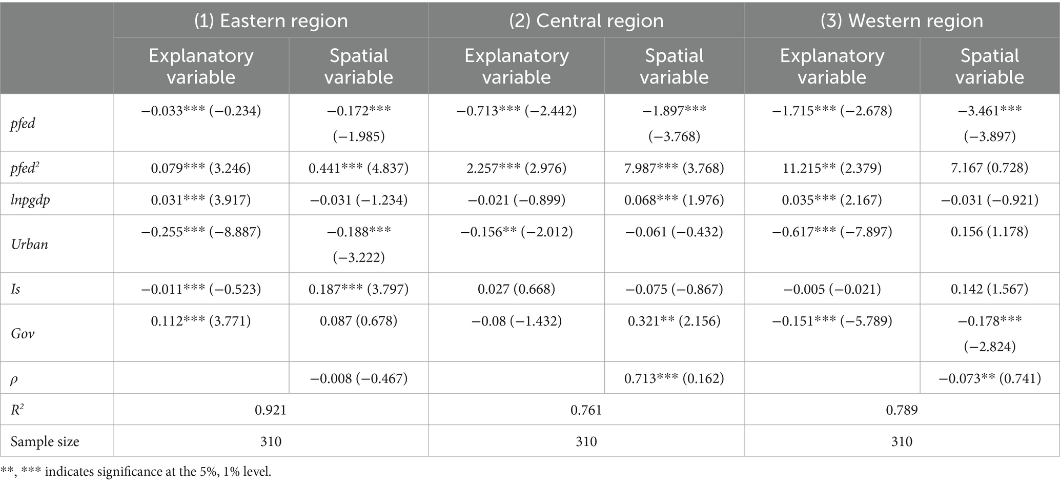 To analyze the impact of platform economy’s characteristics and infrastructure on its development speed, this paper divides the average platform economy development level index of 31 provinces from 2015 to 2024 into three groups: East, Central, West, and conducts spatial econometric regressions separately (Zhao, 2020). Limitations of the traditional east-central-west regional classification and the use of the spatial Durbin model, this study refers to existing research and conducts heterogeneity analysis based on the platform economy development level index. Columns (1)–(3) in Table 11 show the results of spatial econometric regressions for provinces with east, central, west platform economy development levels, respectively (Yang and Li, 2023). Except for the spatial spillover effect coefficient of the low-level group, the coefficients and spatial spillover effect coefficients of the three groups are significant. The coefficients of pfed are negative, and those of pfed2 are positive, showing a “U”-shaped relationship between platform economy development and urban–rural income gap, consistent with the overall sample model. Provinces with high platform economy development have significant spatial spillover effects, similar to the overall sample regression results. Those with medium platform economy development have significant spatial spillover effect coefficients with larger absolute values than the overall sample regression coefficients, indicating stronger spatial spillover effects. In provinces with low platform economy development, the spatial spillover effect coefficient of the core explanatory variable is significantly negative, showing a negative spillover effect, where an increase in the platform economy development level in neighboring provinces widens the urban–rural income gap in the local province. Provinces with high and medium platform economy development should assist those with low development, while the latter also need to adopt development strategies.