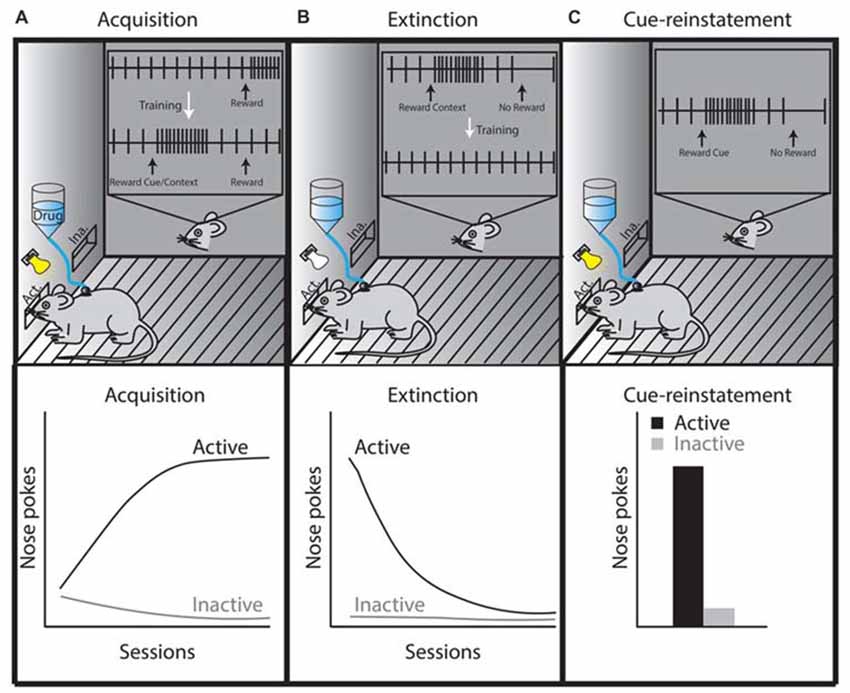 Figure 2. Theoretical illustration of dopamine neuron activity during three different self-administration phases, which is based on phasic dopamine release that occurs in the NAc during drug self-administration, extinction, or reinstatement (Phillips et al., 2003; Stuber et al., 2005). (A) In the acquisition or maintenance phases, animals are placed in a specific context in which they learn that active lever presses or nose pokes elicit intravenous drug administration (this is sometimes paired with a cue, which becomes associated with the rewarding properties of the drug). Once acquired, as shown by steady increases in daily active lever or nose pokes (lower left graph, black line), the maintenance phase is initiated and the animals’ active lever presses or nose pokes reach a plateau. The inset in panel (A) shows the activity of a midbrain dopamine neuron during drug self-administration. The firing of the dopamine neuron is precisely timed with reward prediction errors (RPEs) such that an unexpected delivery of drug elicits phasic dopamine neuron firing. When these rewards are repeatedly preceded by a cue, phasic dopamine neuron firing shifts from occurring at the time of reward to occurring at the time of exposure to the reward-predicting cue. (B) The extinction phase refers to extinguishing the behavior learned during the acquisition/maintenance phase (lower middle graph, black line), which occurs by eliminating drug delivery after the animal completes a learned behavioral response to obtain the drug (e.g., an active lever press or nose poke). This behavior is performed in the absence of a cue in tests requiring cue-reinstatement. The inset in panel (B) shows that omitting the expected reward (negative RPE) inhibits dopamine neuron firing. However, drug-associated contexts (i.e., house light, lever or nose poke hole) are likely to induce phasic firing of dopamine neurons until these learned associations are updated during extinction training (McFarland and Ettenberg, 1997; Crombag and Shaham, 2002; Stuber et al., 2005). (C) Drug-associated cues reinstate the learned behavior of active nose pokes (lower right graph, panel C). If the reward is omitted following the cue presentation (negative RPE), the tonic firing of dopamine-neurons would be inhibited at the time the reward is expected (inset, panel C). If this reward omission is repeated, dopamine neurons no longer show phasic firing patterns during reward-predicting cue re-exposure (Schultz et al., 1997; Schultz, 2016). The precise timing of dopamine-neuron firing controls cue-reward learning making the phasic firing of dopamine neurons an important neural mechanism responsible for the adaptability of reward-seeking behaviors.