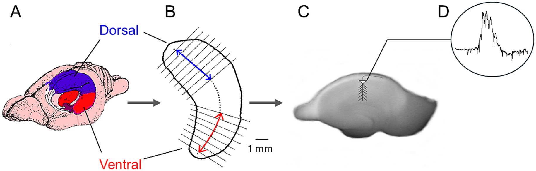 Figure 1. Method used to prepare dorsal and ventral hippocampal slices and record spontaneous activity. (A) Schematic illustration of the rat brain showing the dorsal and ventral hippocampal regions. (B) Outline of a hippocampus indicating the dorsal and ventral segments used to prepare transverse slices. (C) Photograph of a hippocampal slice with the recording electrode positioned in CA1. (D) Example trace of spontaneous activity.