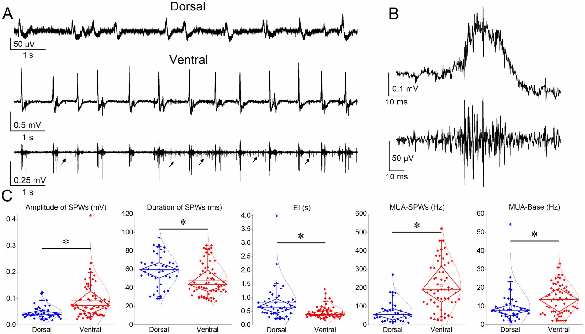 We compared sharp wave events (SPWs) and multi-unit activity (MUA) recorded from the dorsal and ventral hippocampus.