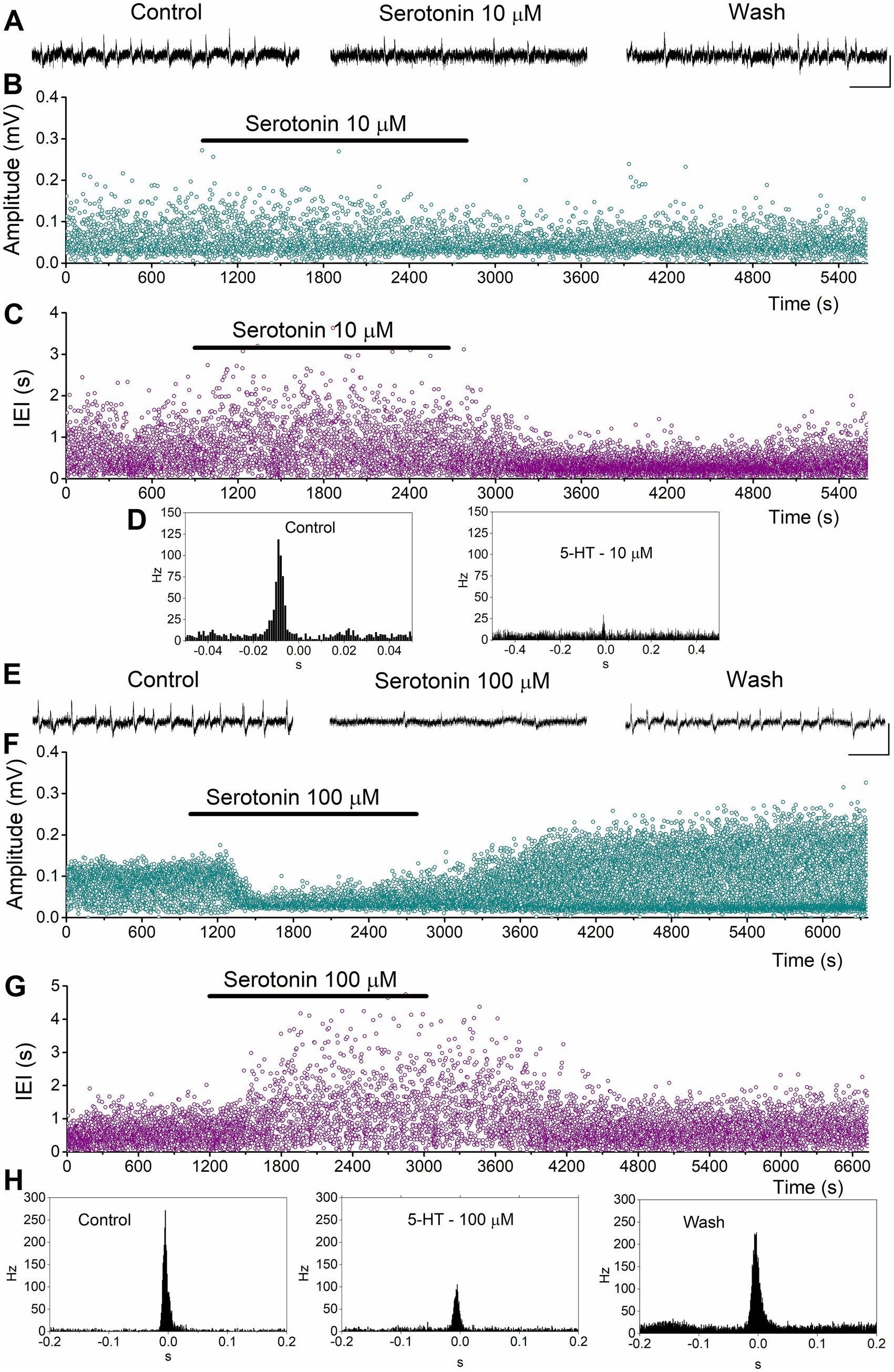 Figure 3. Examples of the effects of serotonin on SPWs and MUA in the dorsal hippocampus. (A–D) Effects of 10 μM serotonin. Continuous recordings (A), instantaneous histograms of SPW amplitude (B), inter-event interval (IEI, C), and peri-event histograms of MUA triggered by SPW peak positivity (D) are shown. (E–H). Effects of 100 μM serotonin. Continuous recordings (E), instantaneous histograms of SPW amplitude (F), inter-event interval (IEI, G), and peri-event histograms of MUA triggered by SPW peak positivity (H) are shown. Calibration bars in continuous recordings: 0.1 mV, 2 s.