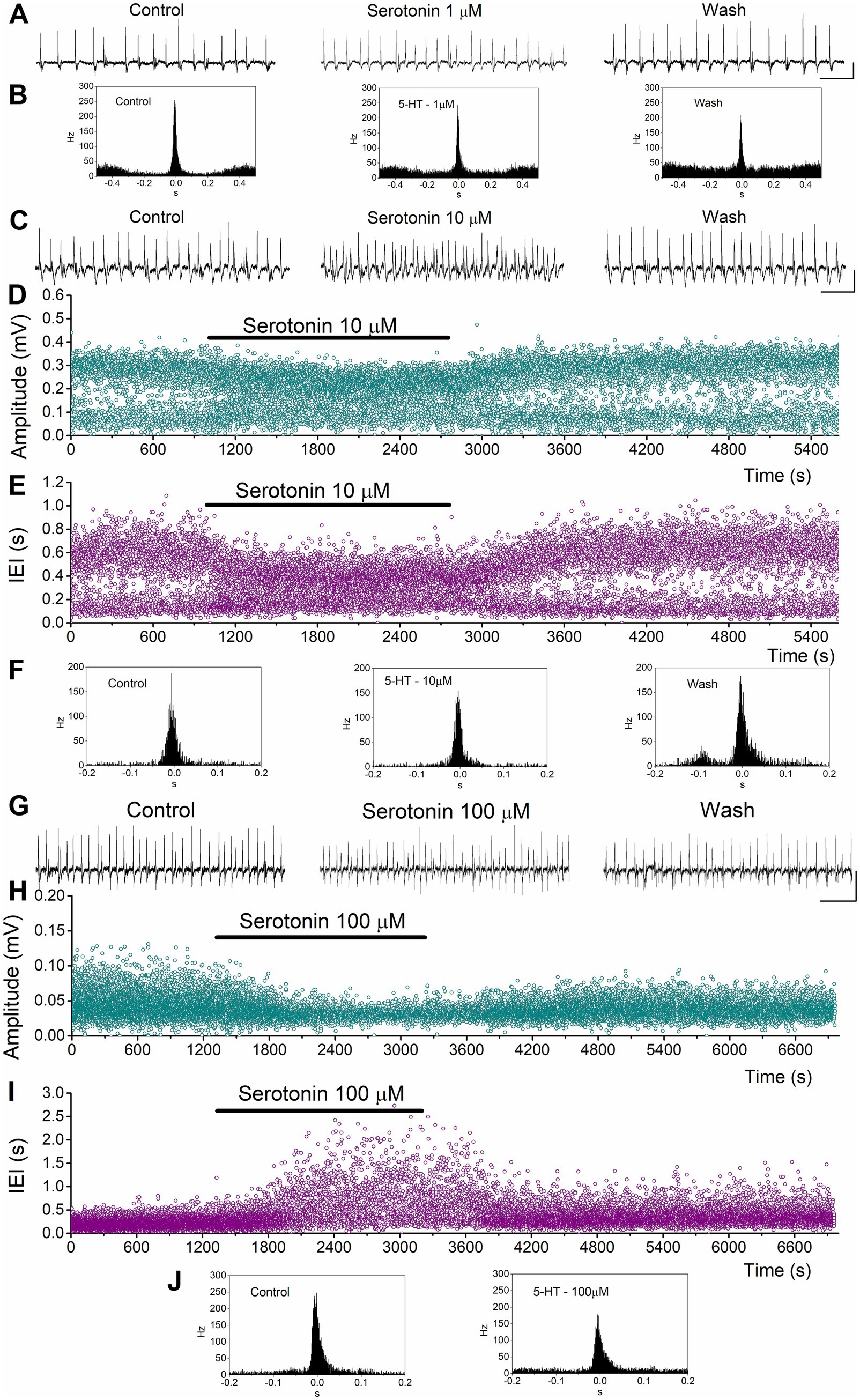 Figure 4. Examples of the effects of serotonin on SPWs and MUA in the ventral hippocampus. (A,B) Effects of 1 μM serotonin. Continuous recordings (A), and peri-event histograms of MUA triggered by SPW peak positivity (B) are shown. (C–F) Effects of 10 μM serotonin. Continuous recordings (C), instantaneous histograms of SPW amplitude (D), inter-event interval (IEI, E), and peri-event histograms of MUA triggered by SPW peak positivity (F). (G–J) Effects of 100 μM serotonin. Continuous recordings (G), instantaneous histograms of SPW amplitude (H), inter-event interval (IEI, I), and peri-event histograms of MUA triggered by SPW peak positivity (J). Calibration bars in continuous recordings: 0.1 mV, 2 s.