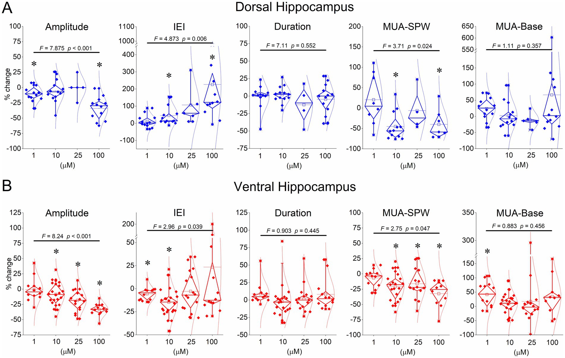 Figure 5. Summary data showing the effects of serotonin on SPW amplitude, IEI, MUA-SPW, and MUA-Base. Breaks in the Y-axis in some graphs are shown for clarity. The results of the ANOVA are indicated at the top of the plots. Asterisks denote statistically significant drug effects (p < 0.05). The statistical evaluation of serotonin’s effects at concentrations of 1 μM, 10 μM, 25 μM, and 100 μM is as follows: Dorsal hippocampus - Amplitude: z = −2.197, p = 0.028; t = −1.492, p = 0.161; z = −0.944, p = 0.345; t = −4.029, p = 0.002 - IEI: z = 0.711, p = 0.477; z = 3.040, p = 0.002; z = 2.023, p = 0.043; t = 2.367, p = 0.037 – Duration: z = −0.580, p = 0.532; t = 0.184, p = 0.857; z = −0.730, p = 0.465; z = −0.786, p = 0.432 – MUA-SPW: z = −0.280, p = 0.779; z = −2.903, p = 0.004; z = −0.730, p = 0.465; t = −2.192, p = 0.071 - MUA-Base: t = 1.219, p = 0.248; z = −0.804, p = 0.422; z = −1.753, p = 0.080; z = −0.392, p = 0.695. Ventral hippocampus: Amplitude: t = 0.515, p = 0.617; t = −2.484, p = 0.022; z = −2.999, p = 0.003; z = −3.059, p = 0.002 - IEI: t = −2.920, p = 0.014; z = −3.393, p < 0.001; z = −0.672, p = 0.501; z = −0.392, p = 0.695; Duration: t = 1.871, p = 0.088; t = −1.142, p = 0.268, t = 0.232, p = 0.819; t = 1.075, p = 0.305 – MUA-SPW: t = −0.751, p = 0.470; t = −4.314, p < 0.001; z = −2.103, p = 0.035; t = −3.593, p = 0.006 - MUA-Base: t = 2.835, p = 0.016; t = 0.658, p = 0.518; z = −0.596, p = 0.551; t = 1.290, p = 0.229. Typically, the effects of serotonin were reversible upon washout of the drug in the dorsal hippocampus: Amplitude: z = −1.376, p = 0.169; t = 0.076, p = 0.941; z = −0.674, p = 0.500; t = 1.575, p = 0.146 - IEI: z = −1.274, p = 0.203; z = −0.943, p = 0.345; z = −0.674, p = 0.500; t = −1.111, p = 0.293; Duration: t = 1.526, p = 0.161; t = 0.313, p = 0.760; z = −0.730, p = 0.465; t = 0.590, p = 0.568 – MUA-SPW: t = 0.147, p = 0.889; z = −1.255, p = 0.209; z = 0.000, p = 1.000; t = −1.895, p = 0.107 - MUA-Base: t = 1.833, p = 0.100; z = −0.804, p = 0.422; z = −1.461, p = 0.144; z = −1.334, p = 0.182. Ventral hippocampus: Amplitude: z = −0.178, p = 0.859; z = −0.035, p = 0.972; z = −0.672, p = 0.501; z = −0.622, p = 0.534 – IEI: t = 1.219, p = 0.251; z = −0.081, p = 0.935; z = −2.017, p = 0.044; t = 0.794, p = 0.446 - Duration: z = −1.824, p = 0.068; t = −0.459, p = 0.652; t = 1.253, p = 0.229; t = 2.643, p = 0.025 - MUA-SPW: t = −1.977, p = 0.076; t = −0.644, p = 0.528; z = −1.013, p = 0.311; t = −1.368, p = 0.209 - MUA-Base: t = 0.673, p = 0.516; z = −0.926, p = 0.355; z = −1.570, p = 0.116; t = 1.214, p = 0.259.