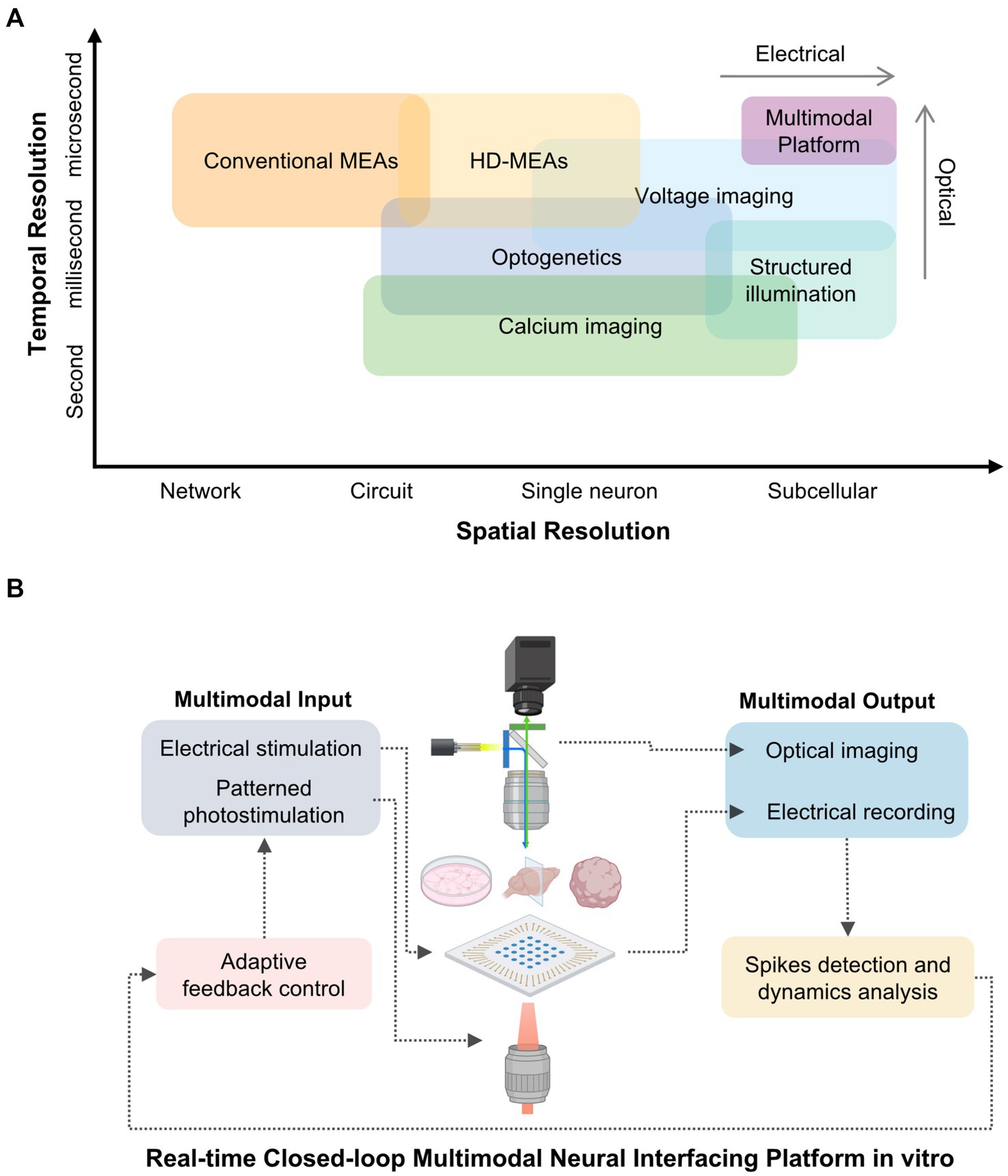Figure 1. Comparative resolution and conceptual framework of multimodal in vitro neural interfacing platforms. (A) Spatial and temporal resolution of representative neural interfacing techniques. Electrical methods such as conventional and high-density microelectrode arrays (MEAs) provide millisecond-scale temporal fidelity but limited spatial resolution. Optical approaches, including calcium imaging and optogenetic stimulation, achieve single-cell or subcellular specificity at slower temporal rates. Voltage imaging bridges this gap with millisecond-resolved optical access, while structured-illumination strategies further enhance spatial precision. These techniques form the basis for multimodal platforms that integrate electrical and optical interrogation of biological neural networks (BNNs). (B) Conceptual schematic of an integrated multimodal platform combining electrical and optical modalities for bidirectional interrogation of BNNs. Electrical stimulation and patterned photostimulation deliver controlled inputs, whereas electrical recording and optical imaging yield complementary readouts. Real-time spike detection, dynamics analysis, and adaptive feedback close the loop, enabling precise modulation of network activity and investigation of activity-dependent plasticity.