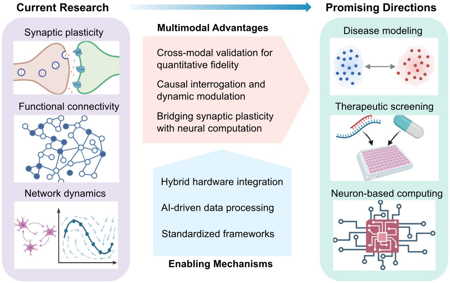 Figure 2. Conceptual landscape of multimodal in vitro neural interfacing: current research, enabling mechanisms, and emerging directions. Current research focuses on the integration of electrical and optical modalities to investigate synaptic plasticity, functional connectivity, and emergent network dynamics. The multimodal approach confers key advantages—including quantitative cross-validation, causal and adaptive control, and the bridging of synaptic mechanisms with network-level computation. These advances are underpinned by key enabling mechanisms such as optical-electrical hardware integration, AI-driven data processing, and standardized experimental frameworks. Collectively, these platforms are converging toward disease modelling, neurotherapeutic development, and neuron-based computing, positioning multimodal systems as a foundation for next-generation translational neurotechnology.
