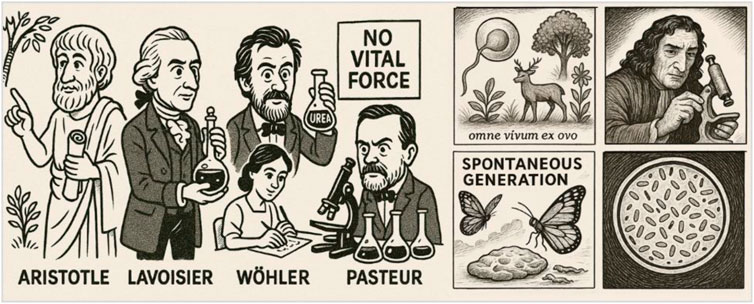 Aristotle (384–322 BC) believed in entelechy (an internal principle of development and purpose) (Chapouthier, 2018). His biology was teleological: living beings had intrinsic purposes and forms (eidos) guiding their growth and behavior (Toepfer, 2012). He explained life through the soul (psyche) as the form of a living body. Although Aristotle was not the originator of the idea of spontaneous generation, which was widespread in antiquity (vide infra), but he was the first to give it a systematic scientific and philosophical formalization within his teleological biology (Mossio and Bich, 2017). Before the 19th century, theories of spontaneous generation, the idea that life could arise from non-living matter, were widely accepted (Lillie, 1942). Vitalism as we know it, the idea that life depends on a special, non-physical force beyond chemistry and physics, came much later (17th–19th centuries) from the work of thinkers like Georg Stahl, Xavier Bichat, and later even Louis Pasteur’s early opponents (Haigh, 1975). However, neither spontaneous generation, nor vitalism survived the formalization of the scientific method from Alchemy, which was an eclectic mix of mystical and proto-scientific doctrines (Harding, 2019).