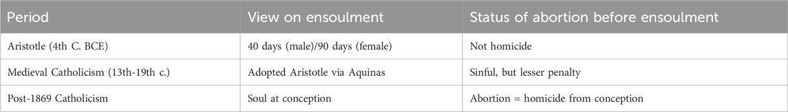 In the 13th century, Aristotle’s natural philosophy entered Western Europe through Latin translations from Arabic and Greek sources. Thomas Aquinas (1225–1274) incorporated Aristotle’s theory of delayed ensoulment into Catholic theology (Owens, 1993). He maintained that the rational soul was created directly by God and infused only after the earlier vegetative and sensitive stages (Skrzypek, 2021). Consequently, early abortion (before ensoulment), while considered sinful was not considered homicide, whereas abortion after ensoulment was classified as homicide (Table 1). In canon law, this distinction was formalized: the Decretals of Pope Gregory IX (1234) differentiated between abortion before and after the “formation” or “animation” of the fetus, and penalties were more severe for abortion after ensoulment (Coriden, 1973). Scientifically, the Aristotelian model aligned with prevailing medieval medical theories, such as Galenic embryology and humoral physiology, and it was widely taught in universities and ecclesiastical schools (French, 1979).