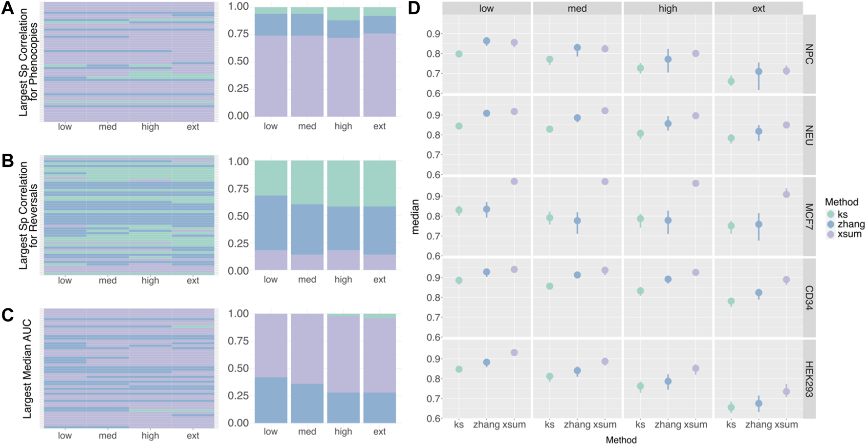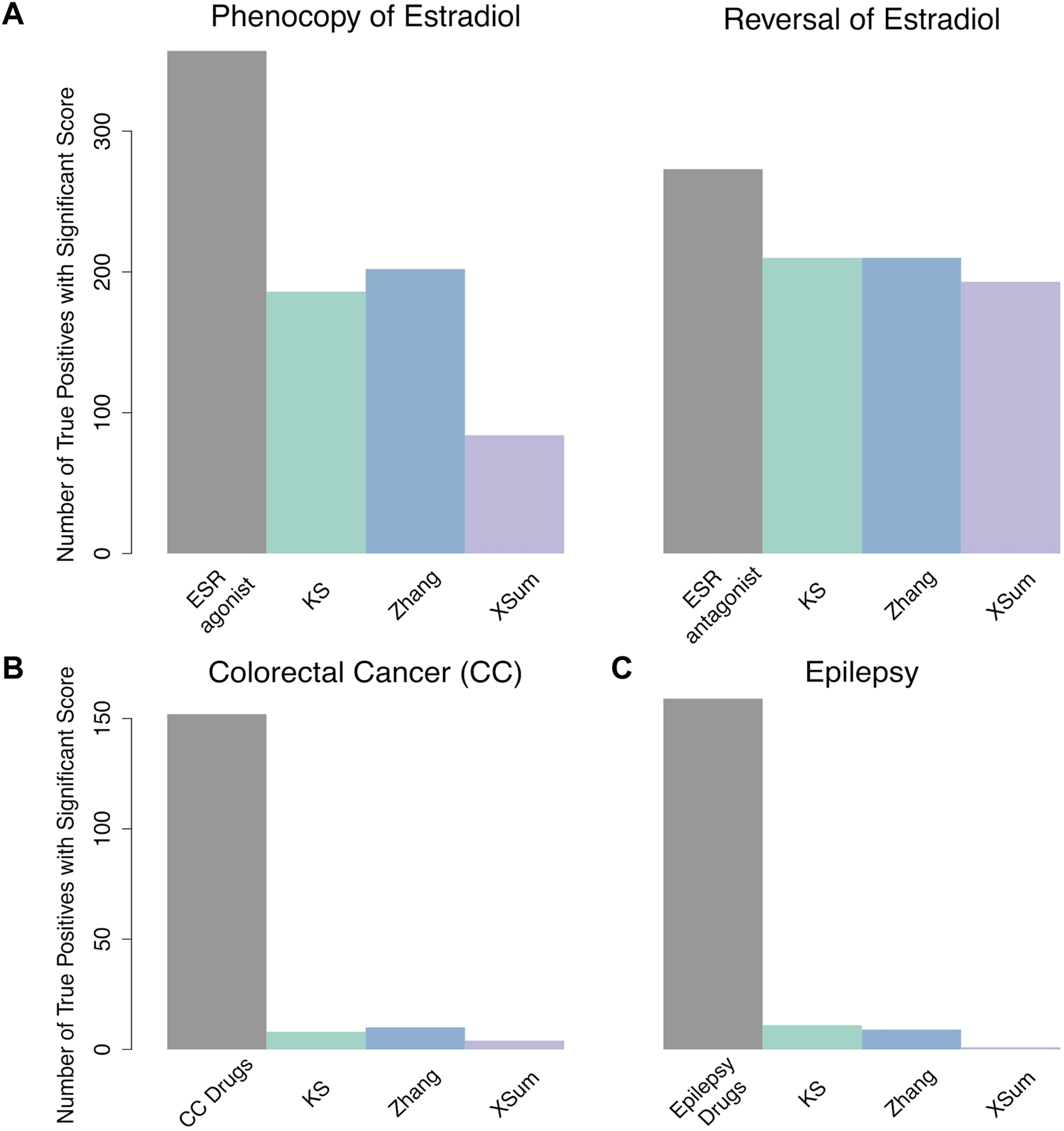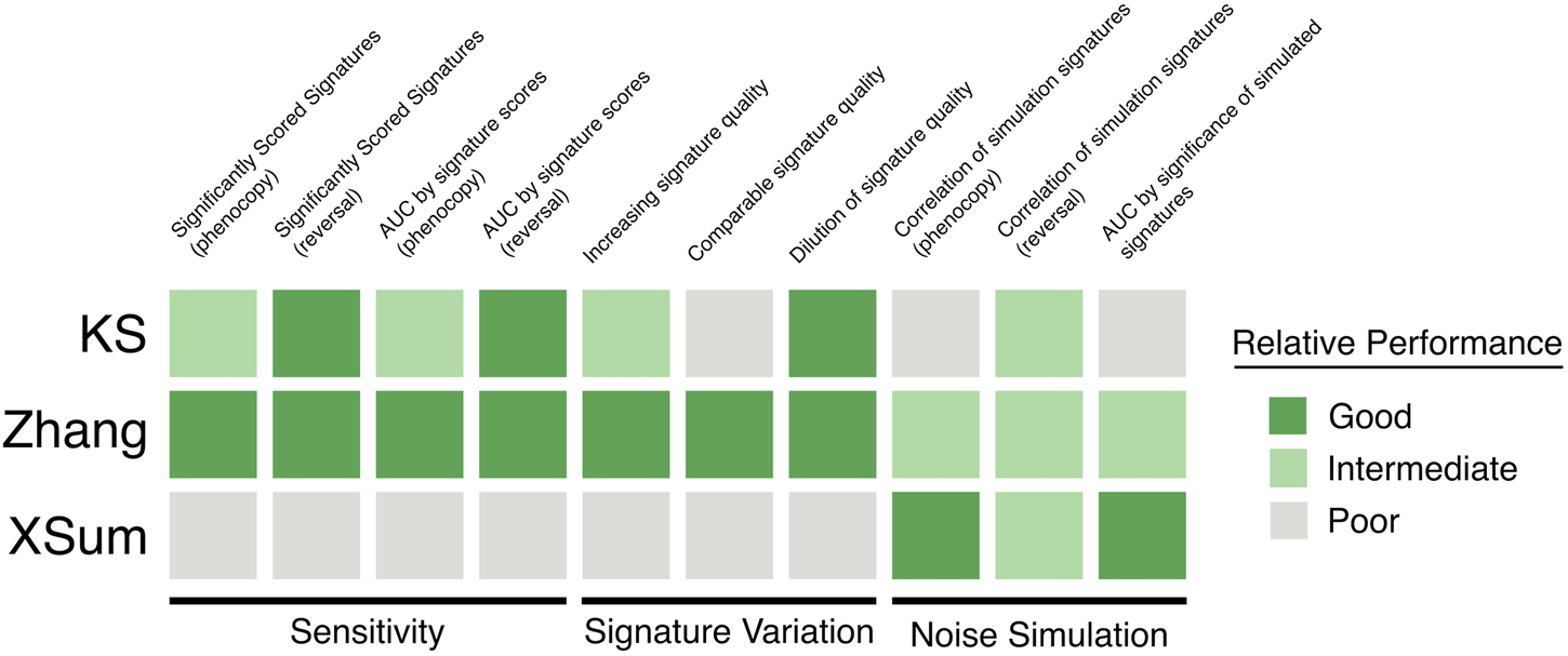 Evaluation of Connectivity Methods. Three disease and one compound signatures were retrieved from published literature and queried against the CMap LINCS database (updated in 2021). Three connectivity methods—KS, Zhang and XSum—were evaluated based on their sensitivity, and their performance due to signature quality variation and noise in gene expression data.