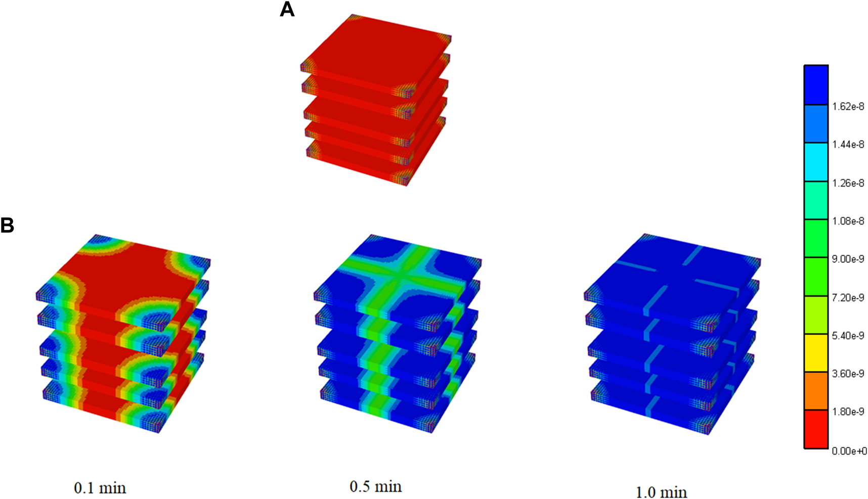3D PAC and PAC-OH distribution levels for Basic case idealized lobule model. (A) PAC distribution for Basic lobule model at 1 min (B) PAC-OH distribution for Basic lobule model at various times.