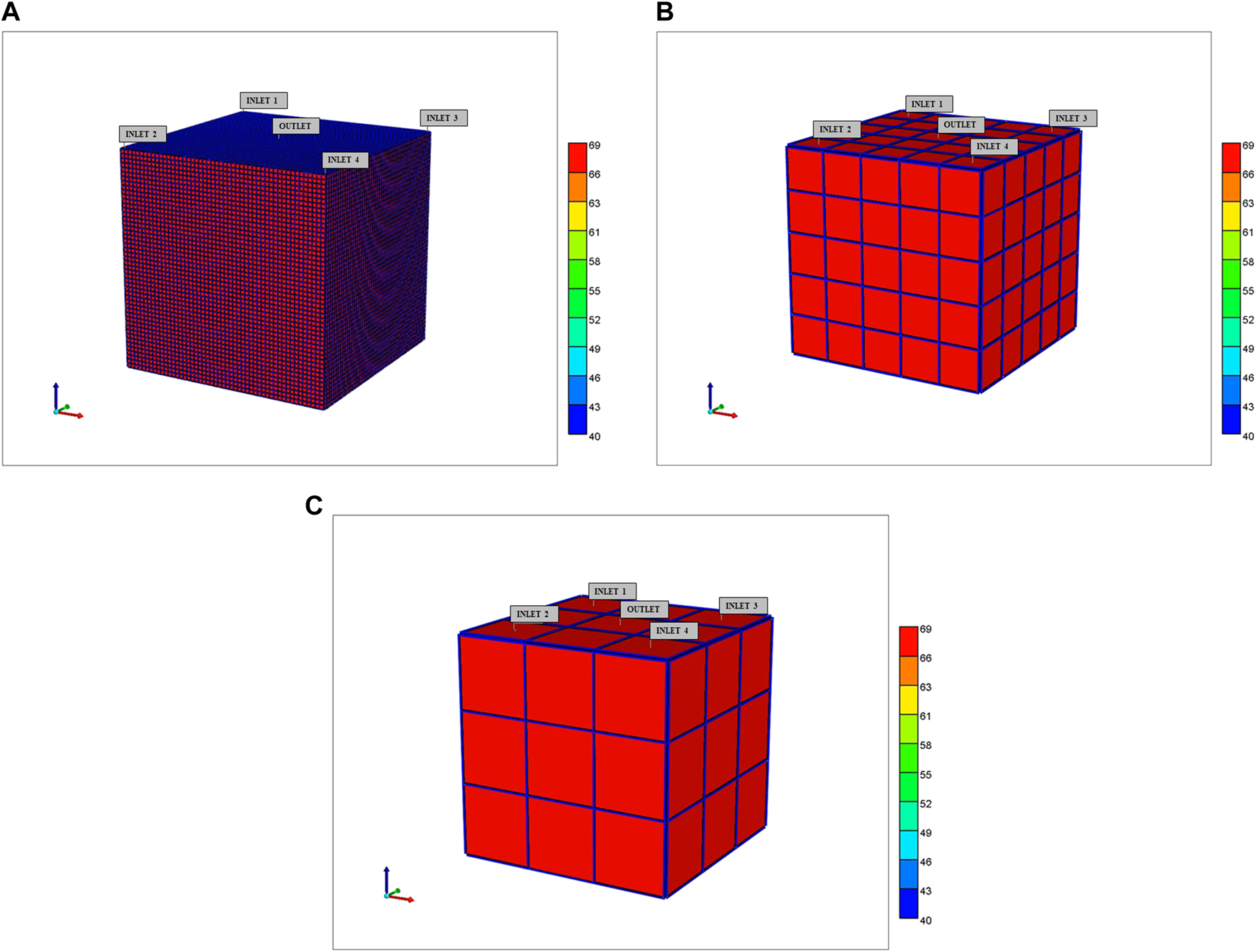 3D Upscaled dual continuum idealized lobule models showing tissue effective properties surrounded by sinusoid effective properties (A) 50 × 50 × 50, (B) 5 × 5 × 5, and (C) 3 × 3 × 3 grids.
