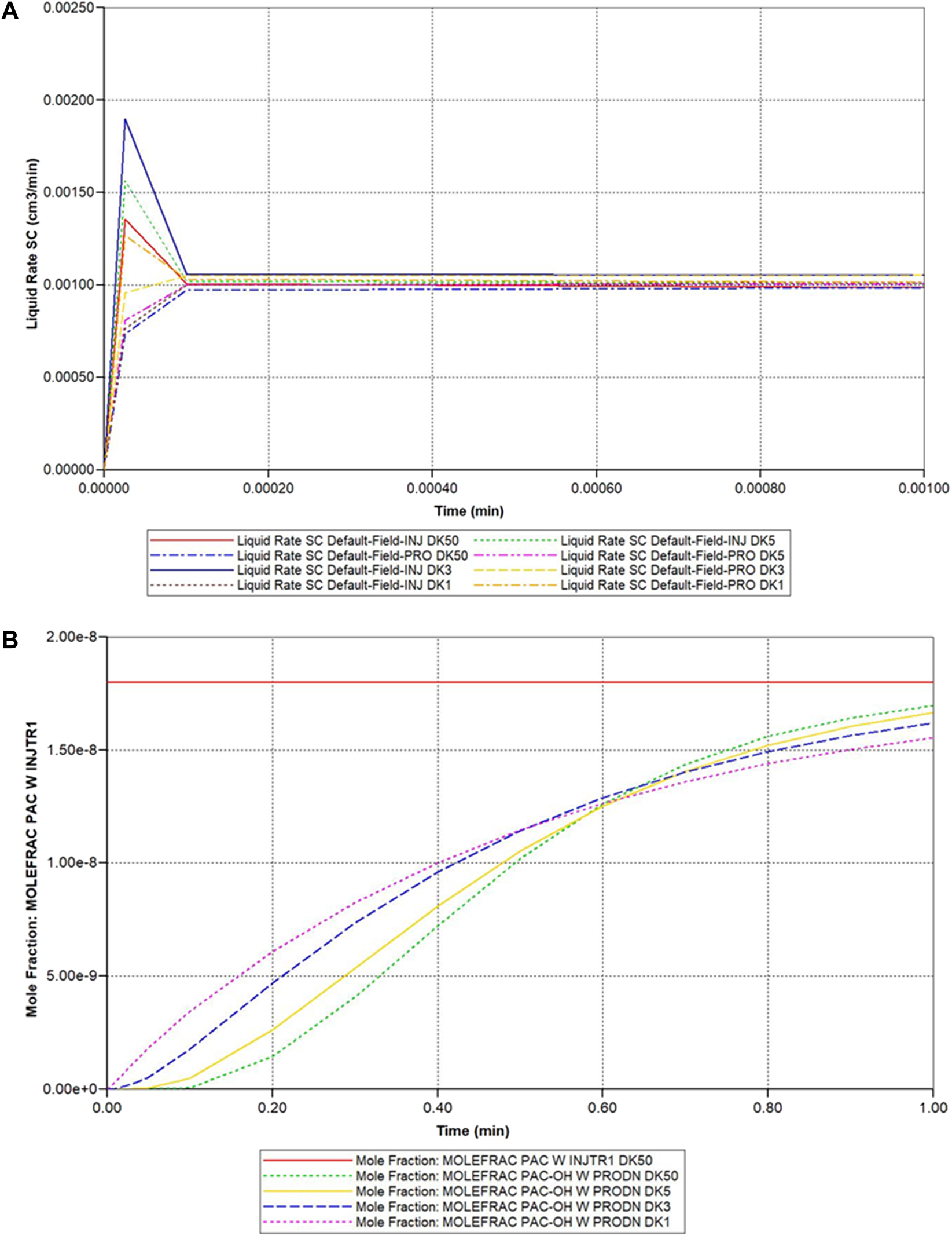 Idealized dual continuum lobule flow characteristics—(A) Injection/production flow rates approach to steady flow (DK models 50 vs. 5 vs. 3 vs. 1 blk). (B) Injected/Produced PAC and PAC-OH (reactive case) up to 1 min (DK models 50 vs. 5 vs. 3 vs. 1 blk).