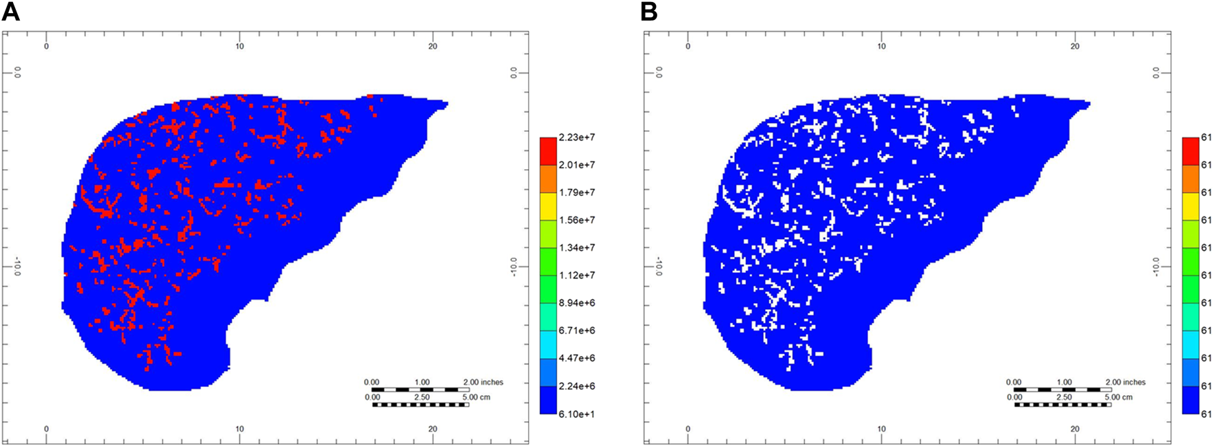 The first two are illustrated in Figures 6B,C while the third (ultimate) case is discussed in detail in what follows. These visualizations show the tissue property values per grid cell, with the sinusoid properties shown as surrounding each tissue grid cell value—these dual continuum visualizations are different than the basic similar continuum representations with only one value for each surrounding sinusoid property, rather than 9 independent values.