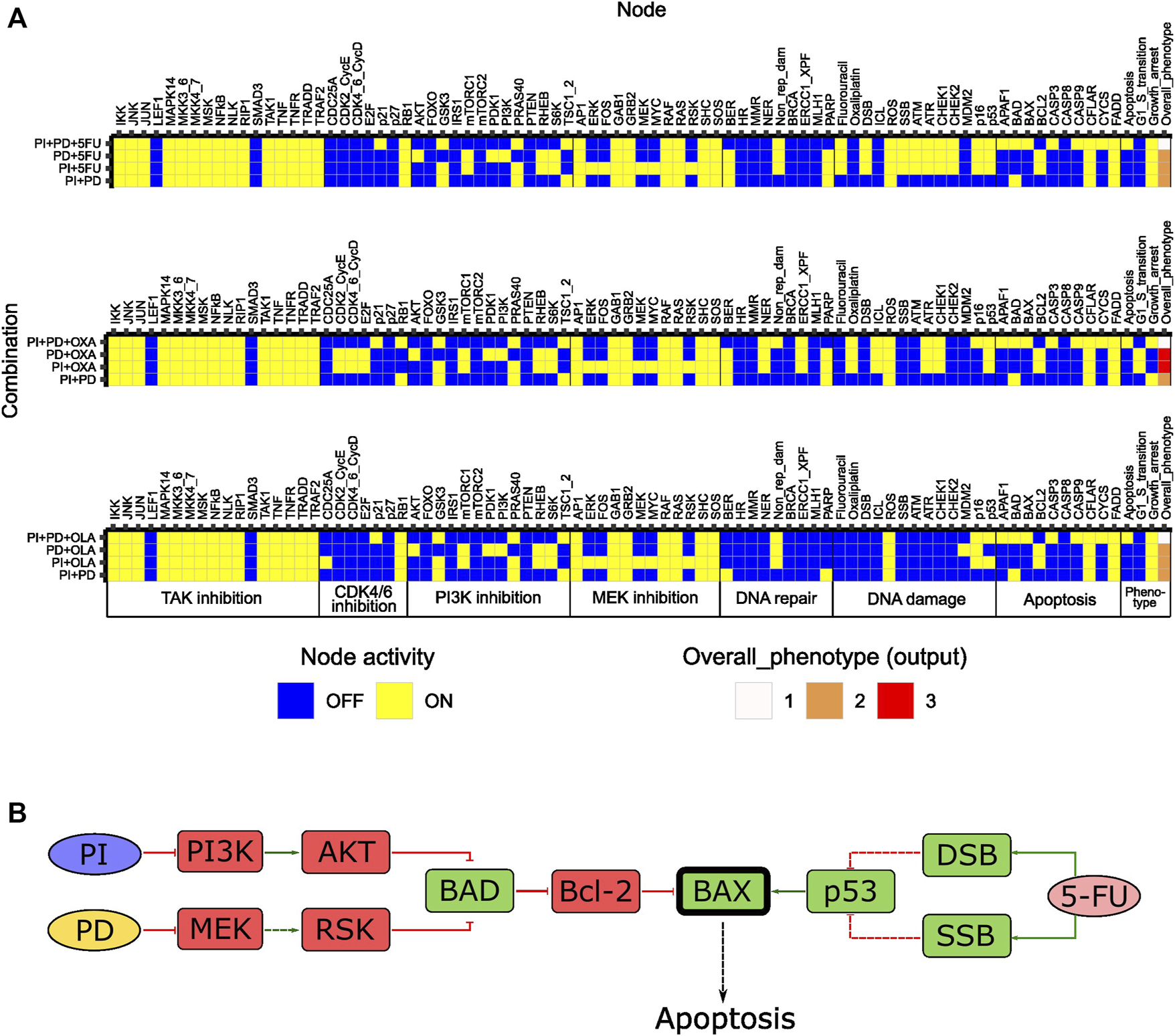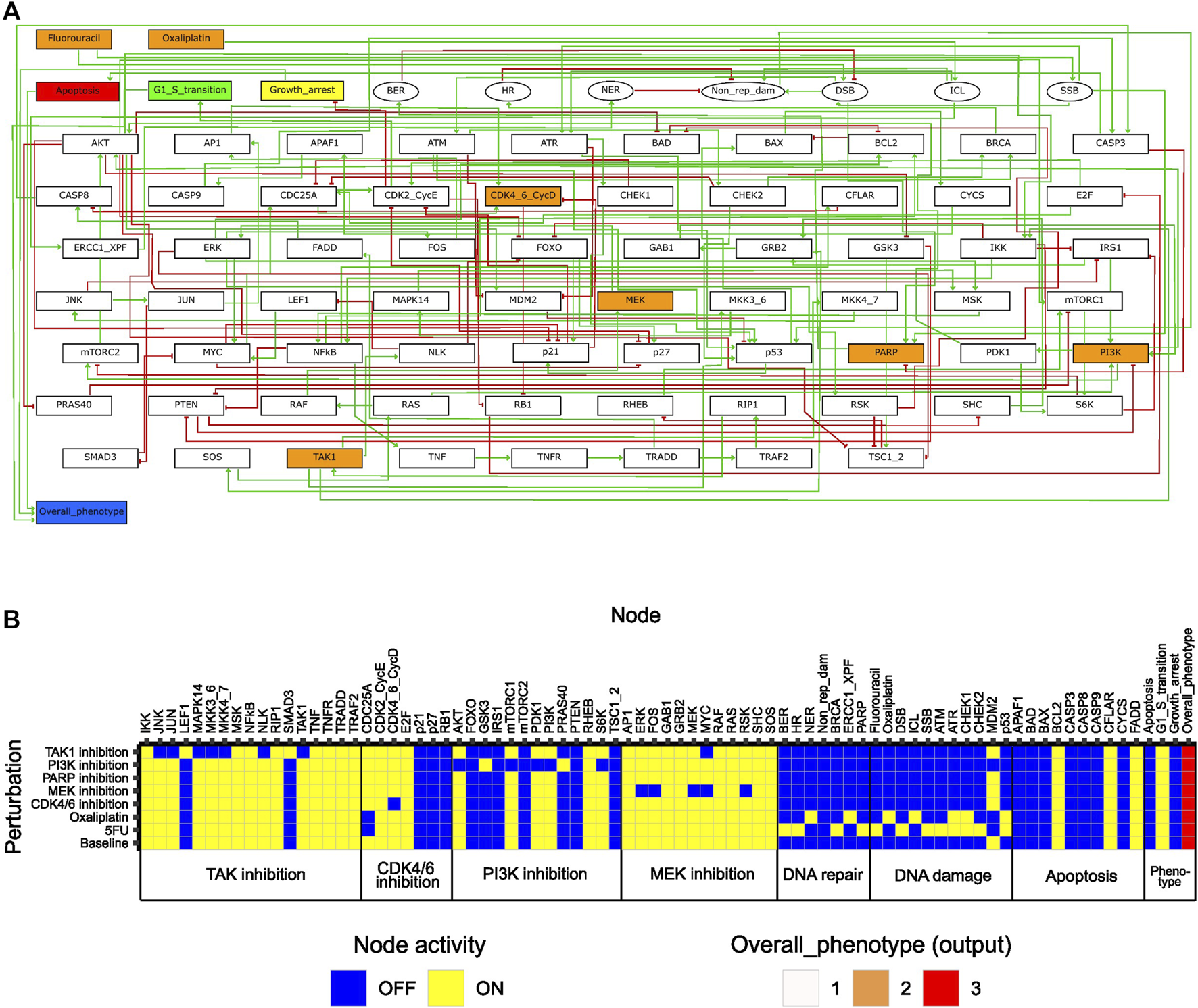 Features of the initial logical model. (A) Model topology; green arrows and red bar-headed lines indicate activation and inhibition, respectively. Orange rectangular nodes correspond to drugs (Fluorouracil/5FU, Oxaliplatin) or drug targets (MEK, PI3K, CDK4_6_CycD, TAK1, PARP; also signaling molecules). White rectangular nodes correspond to other signaling molecules. Elliptic nodes correspond to phenotypes or cellular events associated with DNA damage and repair. Nodes representing phenotypes apoptosis, growth arrest, G1/S transition and overall phenotype are colored in red, yellow, green, and blue, respectively. (B) Stable states (row-wise) computed with the initial model for all individual drug perturbations (single-drug effect), and for the unperturbed (baseline) model. Nodes are categorized based on their association with either a drug target or a phenotypic event.
