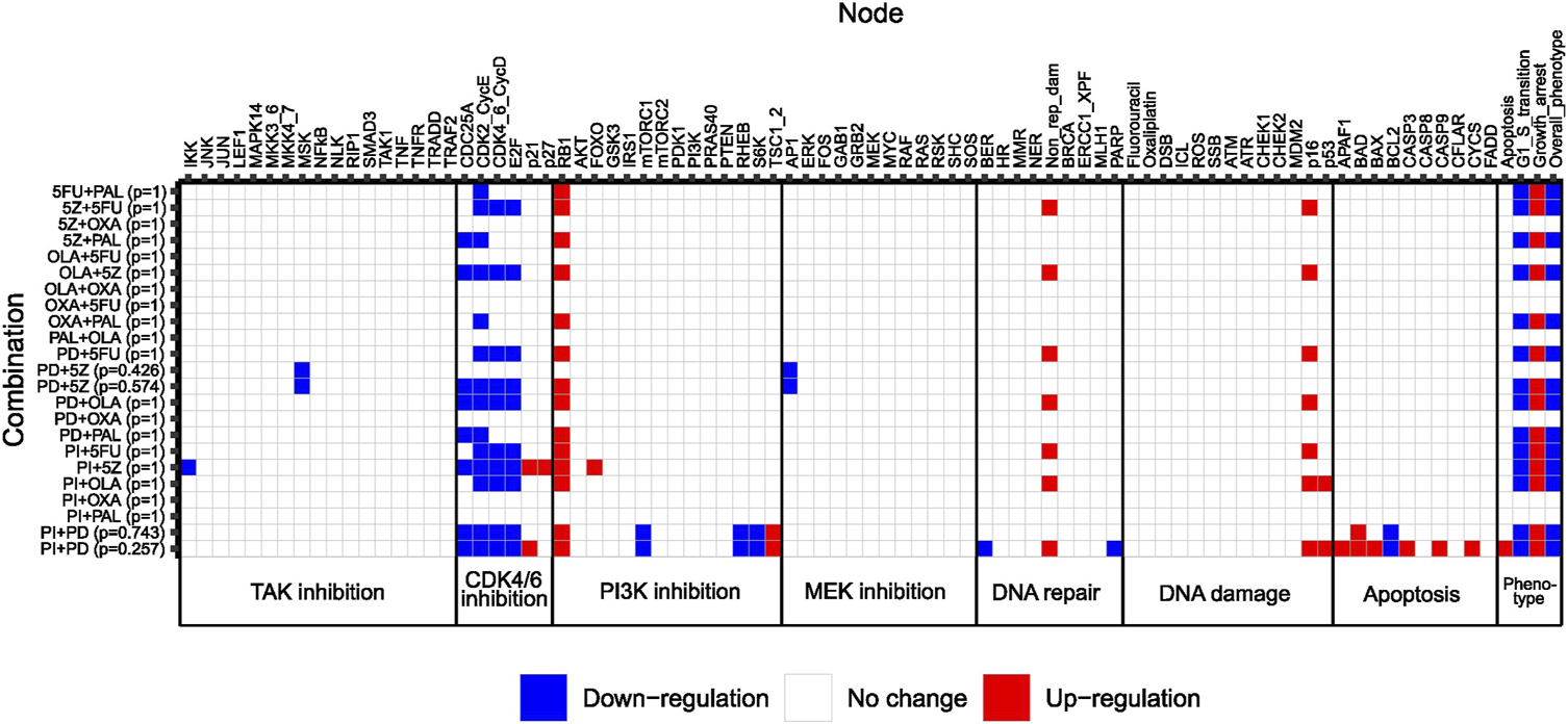 Next, we used our adjusted computational model to study the effect size of pairwise combinations, to conclude whether synergistic higher-order combinations (>2 drugs) would at all be detectable by the model. To study the effect size of pairwise perturbations evaluated during model adjustment (Figure 3), associated stable states were computed for all combinations, followed by recording of the Overall_phenotype level and activities of model nodes. Maximum effect was defined as Overall_phenotype = 1, and hence an apoptotic phenotype, whereas Overall_phenotype = 2, characterized by cell cycle arrest in G1/S phase, was considered a medium effect. Perturbations with no effect on overall phenotype were associated with the highest possible value for Overall_phenotype, 3. Also, to gain further insights into possible mechanisms underlying observed synergistic effects of pairwise combinations, underlying single node perturbations were subjected to the same analysis (stable state analysis and recording of node activity/level), whereafter the differential activity of model nodes could be computed for all pairwise combinations as compared to the effect of underlying single node perturbations (Figure 4). We found that none of the 12 correctly predicted synergies entirely associated with the lowest output level that corresponds to an apoptotic phenotype, Overall_phenotype = 1 (Figure 4). Instead, we found that combined perturbations, when synergistic, often resulted in arrest of the cell cycle in G1/S phase (Figure 4), altogether resulting in the Overall_phenotype = 2. When studying model attractor reachability, one combination (PI + PD) was found capable of inducing apoptosis in a fraction of the simulations (Figure 4), but since the probability for such an outcome (assessed using the Assess attractor reachability algorithm in GINsim) was found to be less than 0.3, growth arrest (Overall_phenotype = 2) was selected as the main output also for this combination. The prediction of a cytostatic rather than cytotoxic synergistic effect of evaluated pairwise drug combinations was supported by data generated in the reference screen, which demonstrated an increase in confluency over time for all tested drug combinations (Supplementary Figure S6, Supplementary File S1: Results, figures, and tables). Here, a decrease in confluency relative to the starting point (drug addition) would have been sign of cytotoxicity. However, as no marker of apoptosis was included for most of the combinations evaluated in the reference screen, an additional apoptotic effect in vitro cannot be ruled out. Computationally, as none of the pairwise perturbations tested by the model did on their own induce a maximum effect (apoptosis/Overall_phenotype = 1), such an effect induced by e.g., perturbation of additional nodes would theoretically still be detectable. We therefore consider the model in its current adjusted state to be well suited for exploring combination effects of higher-order drug combinations in HCT-116 cells.
