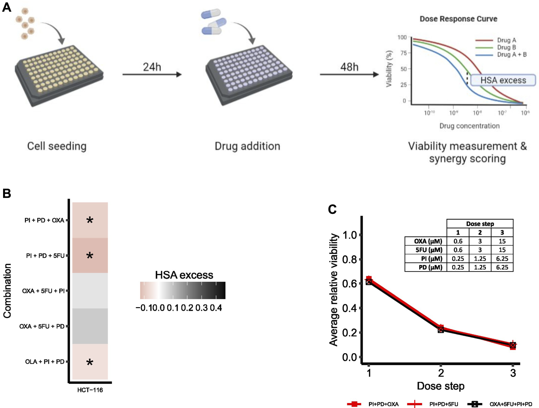 Drug synergy validations. (A) Simplified overview of the screening procedure with synergy scoring exemplified for a second-order combination. (B) Heatmap of HSA excess (viability-based) summed across the dose-ray per combination. Asterisks (*) indicate combinations predicted to be synergistic by the computational model. (C) Viability dose-response curve for HCT-116 cells treated with the fourth-order combination OXA+5FU + PI + PD. The plot shows the fourth-order combination and the two most potent lower-order combinations (PI + PD + OXA, PI + PD+5FU). Concentrations per dose step are presented in the table. To make the plot clearer, error bars are not included.