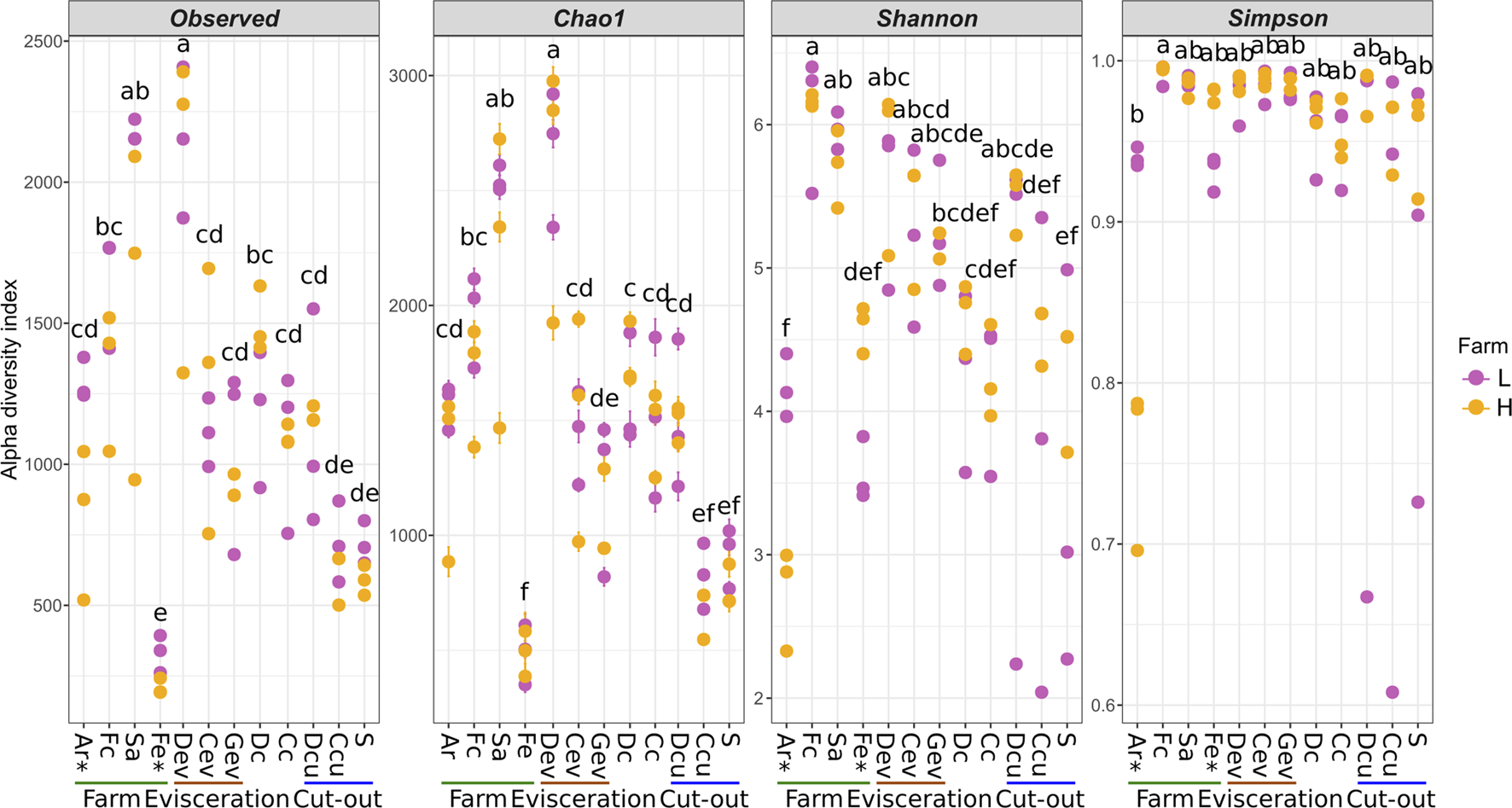 Alpha diversity of the samples along the value chain calculated with different indexes for richness (Observed, Chao1) and both richness and evenness (Shannon, Simpson). Significant differences between the two farms according to a Student T test (p < 0.05) are identified with an asterisk (*) at the bottom of the graph. Significantly different samples are identified with different letters according to a Tukey HSD test (p < 0.05). Samples were collected from air (Ar), feces (Fc), saliva (Sa), feed (Fe), drain at evisceration (Dev), conveyor at evisceration (Cev), blood collection gutter (Gev), dressed carcasses (Dc), cold carcasses (Cc), drain at cut-out (Dcu), conveyor at cut-out (Ccu) and shoulder (S). Farm-L (yellow) or farm-H (pink) with lower and higher sanitary statuses, respectively.