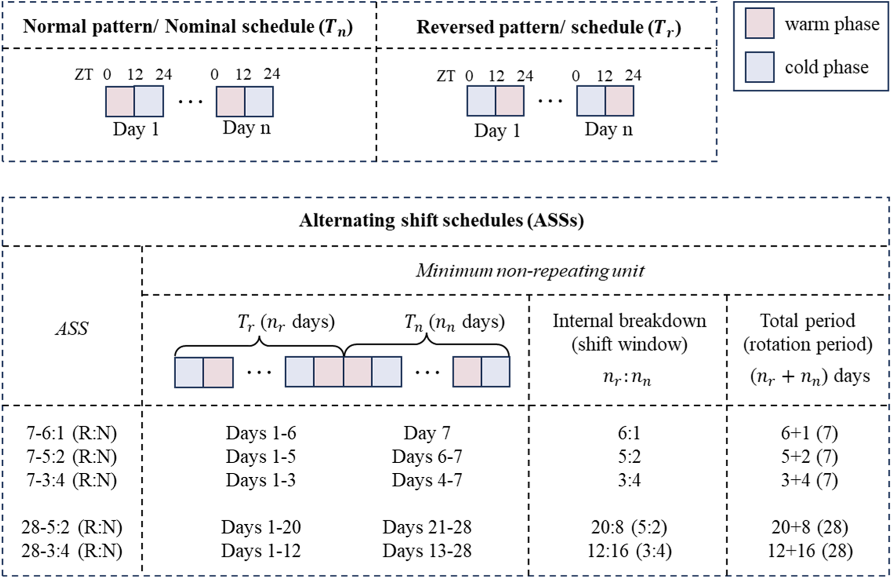 Schematic of temperature schedules. The nominal temperature schedule comprises recurring normal temperature patterns (). The alternating shift schedules (ASSs) consist of the periodic alternation between -day normal temperature patterns () and -day reversed patterns (). The ratio within each minimum non-repeating unit of an ASS defines the schedule’s internal breakdown (or shift window), while the sum , the total period of the minimum non-repeating unit, defines the schedule’s rotation period.