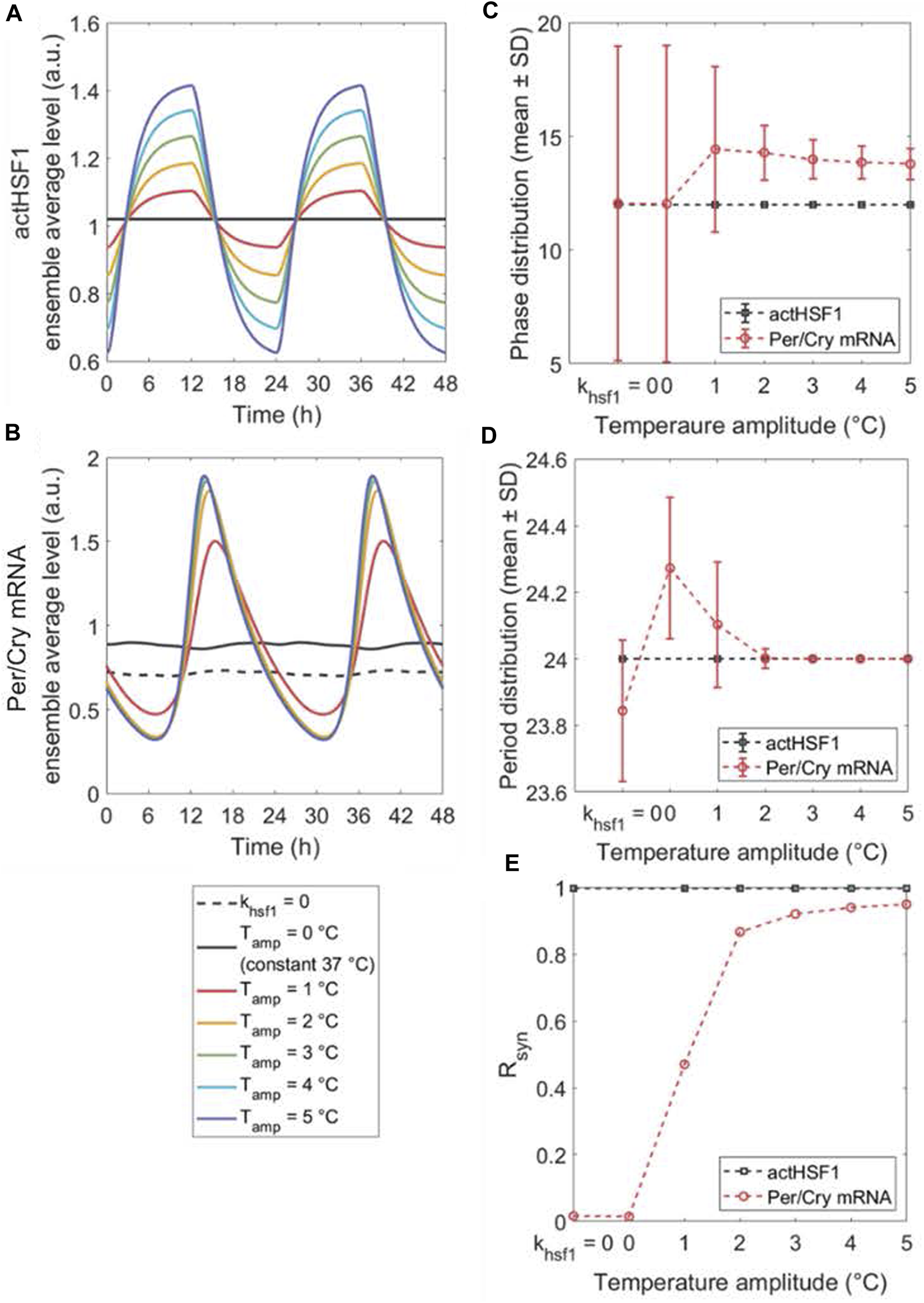 The peripheral synchronization changes in response to amplitude-varying temperature rhythms. The dynamics of ensemble average (A,B), single-cell phase (C) and period (D) distributions, and synchronization degree Rsyn(E) of actHSF1 and Per/Cry mRNA were obtained when peripheral cells are either insusceptible to (by setting khsf1 = 0 in the model) or susceptible to temperature rhythms with amplitudes varying from 0°C to 5°C. The loss of entraining agent (khsf1 = 0) and the elimination of the entrainer rhythm (constant temperature) result in a similar response of cell population, with the only difference in the magnitude of Per/Cry mRNA ensemble average and period. The increase in the amplitude of temperature rhythm enhances the Per/Cry mRNA ensemble average amplitude by more efficiently synchronizing the peripheral cells. This enhancement relies on both the amplification of rhythmic actHSF1 inputs and the inherent oscillating property of clocks.