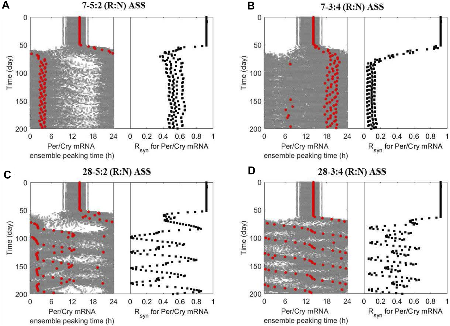 The multicellular system responds to alternating shift schedules (ASSs) in a schedule-dependent manner. The dynamics of ensemble phases (left panel; single-cell phases and their ensemble average denoted by grey and red circles, respectively) and synchronization level (right panel) of peripheral cell clocks were generated when the multicellular system was subject to different ASSs after 50 simulation days: (A) 5-day reversed and 2-day normal (7–5:2 (R:N)), (B) 3-day reversed and 4-day normal (7–3:4 (R:N)), (C) 20-day reversed and 8-day normal (28–5:2 (R:N)) and (D) 12-day reversed and 16-day normal (28–3:4 (R:N)). The system exhibits better circadian adaptation under the 7–5:2 (R:N) than the 7–3:4 (R:N) ASS, as indicated by eventually adopting oscillatory properties (phase and period) of the dominating temperature pattern and maintaining a higher internal synchronization. The slowly rotating schedules (28–5:2 and −3:4 (R:N) ASSs) generally damage the system’s circadian adaptive ability by inducing severe fluctuation in its dynamic phase entrainment and synchronization, implying an underlying destabilization compared to frequently rotating schedules (7–5:2 and - 3:4 (R:N) ASSs).