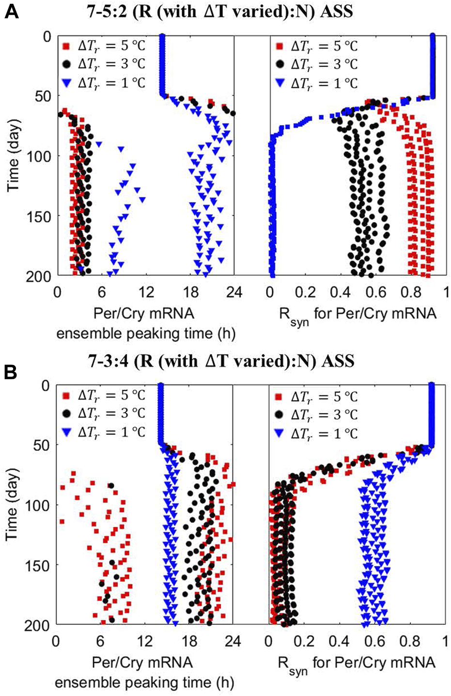 The following temperature schedules are examined: 1) 5-day reversed (R) and 2-day normal (N) shift, 2) 3-day reversed and 4-day normal shift, 3) 6-day reversed and 1-day normal shift every 7 days (essentially simulating, in shorthand, 7–5:2/−3:4/−6:1 (R:N) ASS); 4) 20-day reversed, and 8-day normal shift, 5) 12-day reversed and 16-day normal shift every 28 days (in shorthand, a 28–5:2/−3:4 (R:N) ASS). Schedules (i)-(iii) and (iv)-(v) hold the same rotation periods, respectively, whereas (i) and (iv), (ii), and (v) have the same shift windows, respectively. A detailed depiction of , , and ASSs is provided in Figure A1.