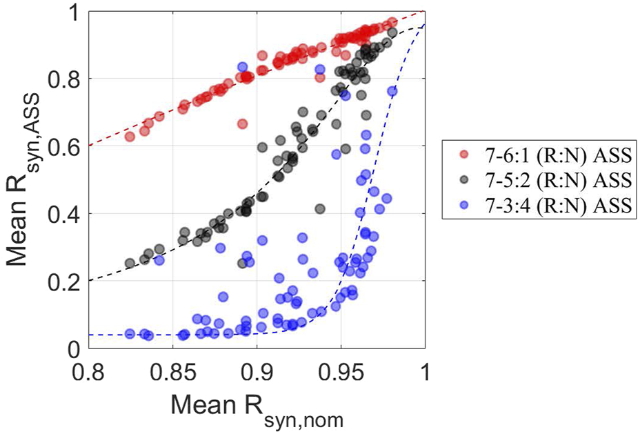 Our first in silico experiments mimic the equivalence to “shift work,” where the system is repeatedly exposed to one zeitgeber schedule followed by a different schedule, each lasting for a certain period of time. Figure 5 shows the dynamics of ensemble phases and synchronization level of peripheral clocks subject to different ASSs (Figure A1). Two parameters define the ASS: a) the total period of the minimum non-repeating unit of schedule and b) the internal breakdown. For example, “7–5:2” implies that we consider a 7-day period during which the system is exposed to one oscillatory pattern for 5 days, and then the pattern is inverted for 2 days. Then, the 7-day cycle repeats in the schedule. Similarly, “7–4:3” implies a 7-day period with 4 days in one pattern and 3 days in the inverted. On the other hand, “28–5:2” means that we consider a 28-day period during which the system is exposed to one temperature pattern for 20 days and then an inverted pattern for 8 days (5:2 is the ratio of days in each pattern). Equivalently, “28–3:4” implies a 28-day non-repeating unit, with 12 days in one pattern and 16 days in the inverted. Specifically, in the simulations that follow, the system is first exposed to a “normal” temperature pattern (, Eq. 16) and then subjected to a schedule that alternates between (Eq. 17) at .