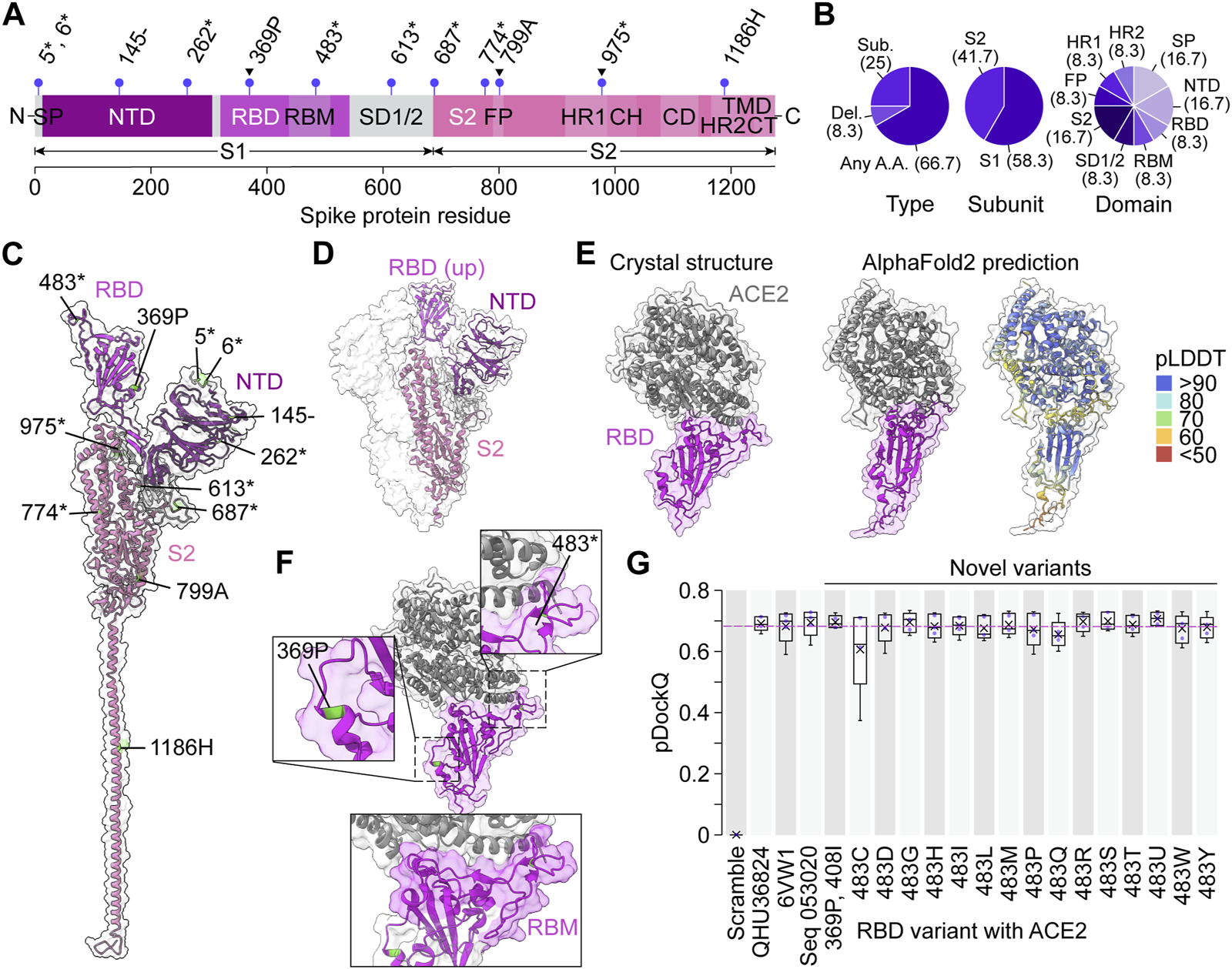 Novel spike protein variants bind ACE2 in silico. (A) Unique variant positions produced by the variational autoencoder that were unseen in the training dataset, indicated by purple lollipops. Arrowheads indicate conserved positions in the training dataset. Asterisks represent any amino acid, dashes represent deletions. CH, central helix; CD, connector domain; CT, cytoplasmic tail; FP, fusion peptide; HR1, heptad repeat region 1; HR2, heptad repeat region 2; NTD, N-terminal domain; RBD, receptor binding domain; RBM, receptor binding motif; S1, S1 subunit; S2, S2 subunit; SD1/2, subdomain 1 and subdomain 2; SP, signal peptide, TMD, transmembrane domain. (B) Percentages (in brackets) of novel predicted variants categorized by type of mutation, spike protein subunit, and spike protein domain. (C) The novel variant predictions mapped onto the crystal structure of a single prefusion spike protein protomer in the “up” conformation. PDB: 6VYB (Walls et al., 2020). (D) Crystal structure of a trimeric prefusion spike protein with a single RBD in the “up” conformation. PDB: 6VSB (Wrapp et al., 2020). (E) Crystal structure of a spike RBD binding human ACE2 compared to the AlphaFold2 prediction of the same sequence. PDB: 6VW1 (Shang et al., 2020). (F) The two novel variants in the RBD mapped on the crystal structure in (E), with the RBM highlighted below. (G) pDockQ scores of AlphaFold2-predicted RBD-ACE2 binding models (n = 5 models each). In each box, x = mean, middle line = median, lower hinge = 25th percentile of the data, upper hinge = 75th percentile of the data, whiskers = 1.5 * interquartile range. Pink dotted line represents the mean pDockQ score of 6VW1.