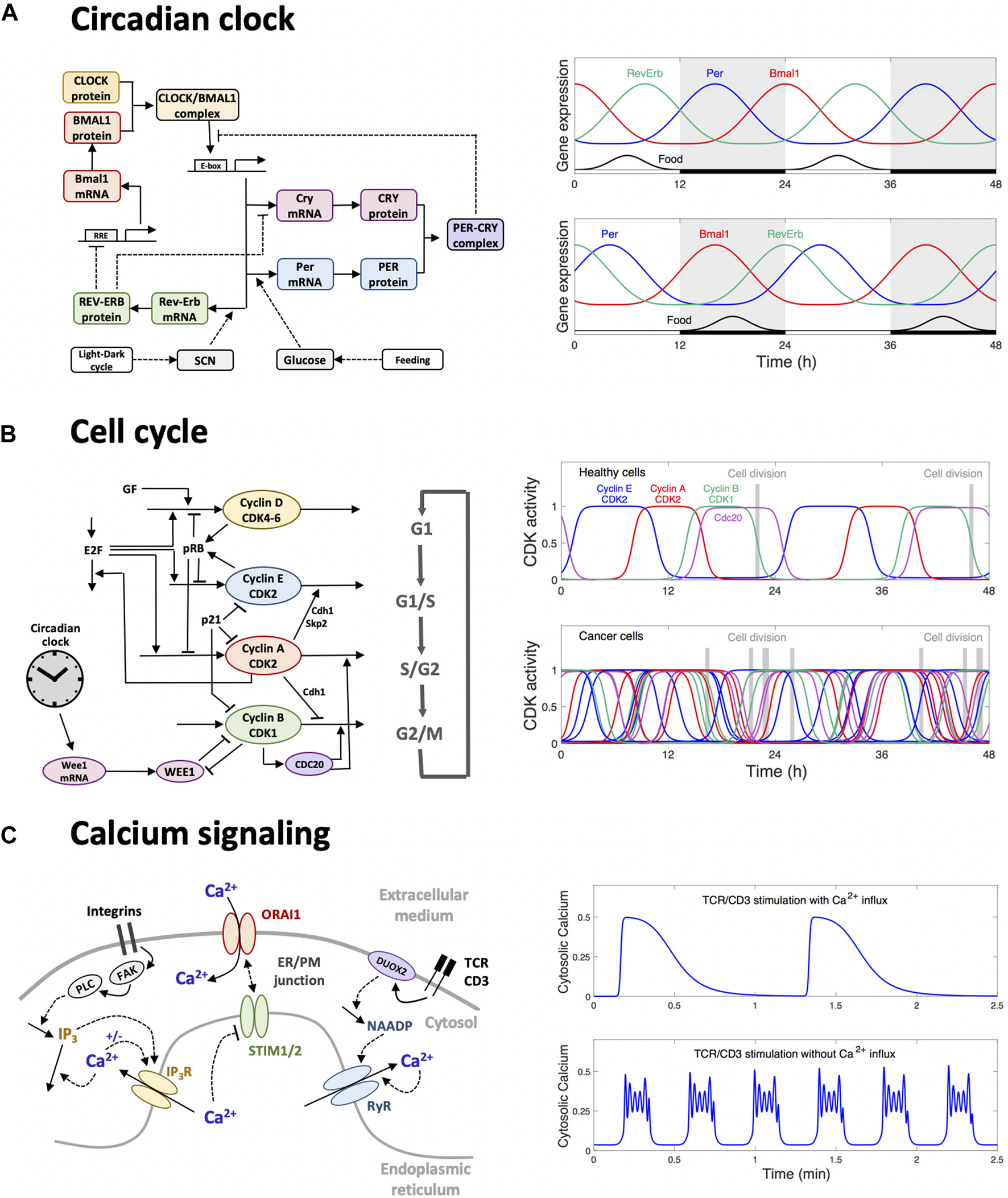 Three examples of oscillatory behaviors successfully addressed by computational modeling. (A) Circadian oscillations originate from a gene regulatory network involving interlocked transcriptional feedback loops (left panel). In peripheral tissues, such as the liver or the pancreas, the circadian oscillators receive inputs from the pacemaker clock located in the brain and responsive to the light-dark cycle, and from nutrient uptake. Wrong-time feeding disrupts the amplitude and phase relationship between the expression profiles of clock genes (right panel), which results in altered clock-controlled outputs such as insulin secretion. In turn, these dysregulations lead to physiological disorders, including hyperglycemia. (B) The progression of the cell into the successive phases of the cell division cycle is governed by a CDK/cyclin network (left panel). Healthy cells are well entrained by the circadian clock such that cells tend to divide at a certain time of the day (top right panel). In cancer cells, the circadian control is often altered. When the coupling strength is weak, many cells are not entrained and thus divide at any time of the day (bottom right panel). This feature can be exploited to optimize the administration time of anti-cancer drugs (chronotherapy). (C) Elements of the Ca2+ signaling toolkit in T cells. Adhesion stimulates phospholipase C (PLC) through the activation of the focal-adhesion kinases (FAK). The rise in IP3 that follows PLC activation provokes the release of Ca2+ from the endoplasmic reticulum (ER). The resulting local depletion in ER Ca2+ activates Ca2+ entry into the cytoplasm at the level of the ER/PM junction. This localized Ca2+ entry creates Ca2+ microdomains, which are highly localized in time and space. Early after TCR/CD3 stimulation, the nicotinic acid adenine dinucleotide phosphate (NAADP) synthesized by the Dual oxidase 2 (DUOX2) enzyme activates Ca2+ release via the ryanodine receptor (RyR), which also creates Ca2+ microdomains with very similar characteristics. Later after stimulation, IP3 is further increased by TCR/CD3 stimulation (not shown in the scheme) leading to global Ca2+ signaling in the form of Ca2+ oscillations. In physiological situations including Ca2+ influx, oscillations are long-lasting, with a low frequency (top right panel), inducing the translocation of nuclear factor of activated T-cells (NFAT) and the activation of the immune response. These oscillations are based on the STIM/ORAI mechanism. In the absence of influx, oscillations are faster and of the bursting type (bottom right panel), which reveals the interaction of other potentially active oscillatory mechanisms.
