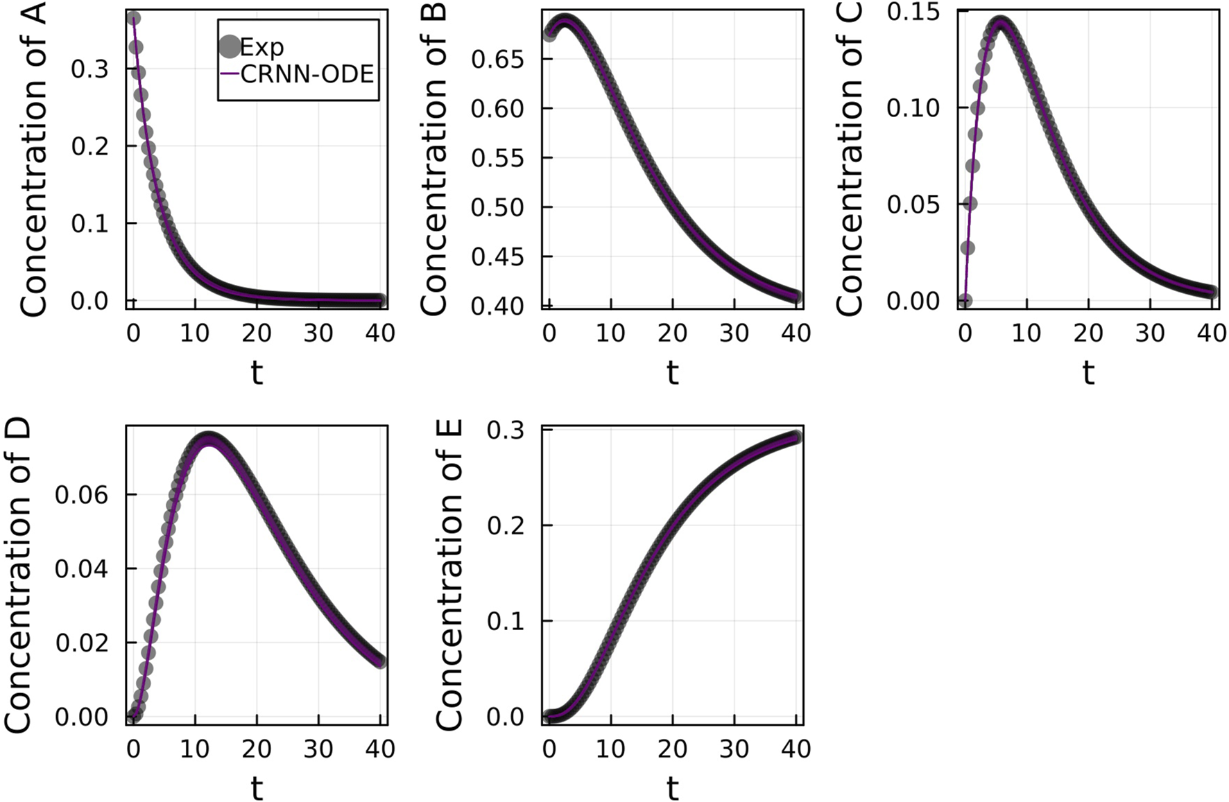Additionally, we compared the Bayesian CRNN to a purely data-driven neural ODE approach, where the structure does not include embedded scientific knowledge. For the neural ODE, we built a densely connected neural network with two hidden layers with 50 nodes each and hyperbolic tangent activation functions. The neural network was trained for 2000 epochs with the ADAM optimizer (learning rate set to 0.001). Here we compare the ability of the learned networks to extrapolate beyond the time points used for training. We use timepoints 0–30s for training and then use the trained system to predict concentrations 30–40 extrapolate to timepoint 40.