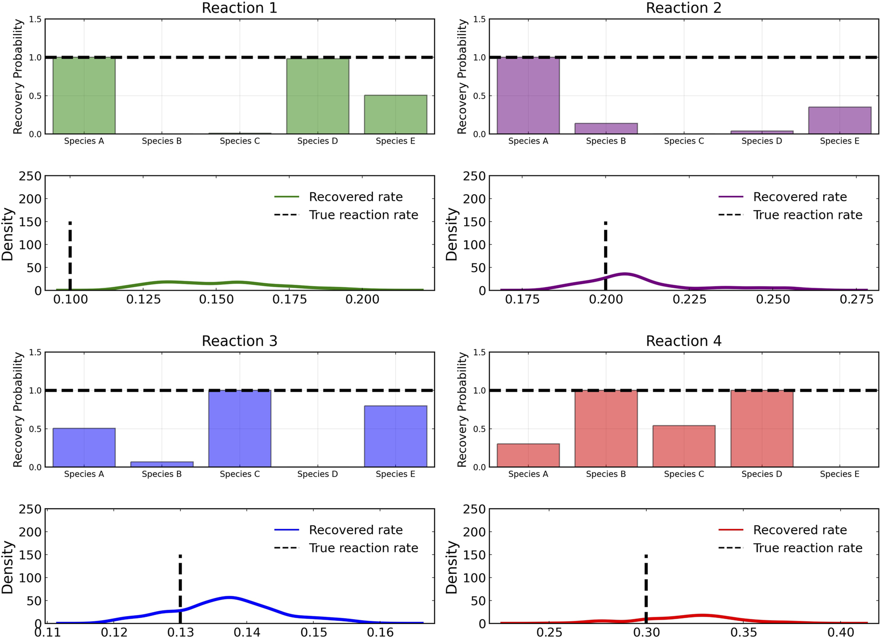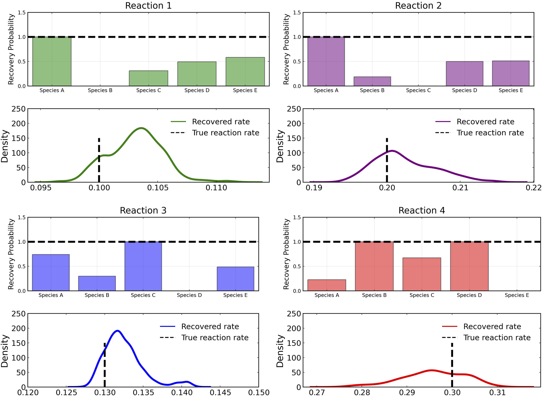 Reactant recovery probability of chemical species (top) and posterior distributions of learned reaction rates (bottom) for the four reactions described in Case 1. The model was trained with moderately noisy data, where the standard deviation of the noise was set to 5% of the concentrations. A posterior set of 1,000 samples was chosen for the estimation.