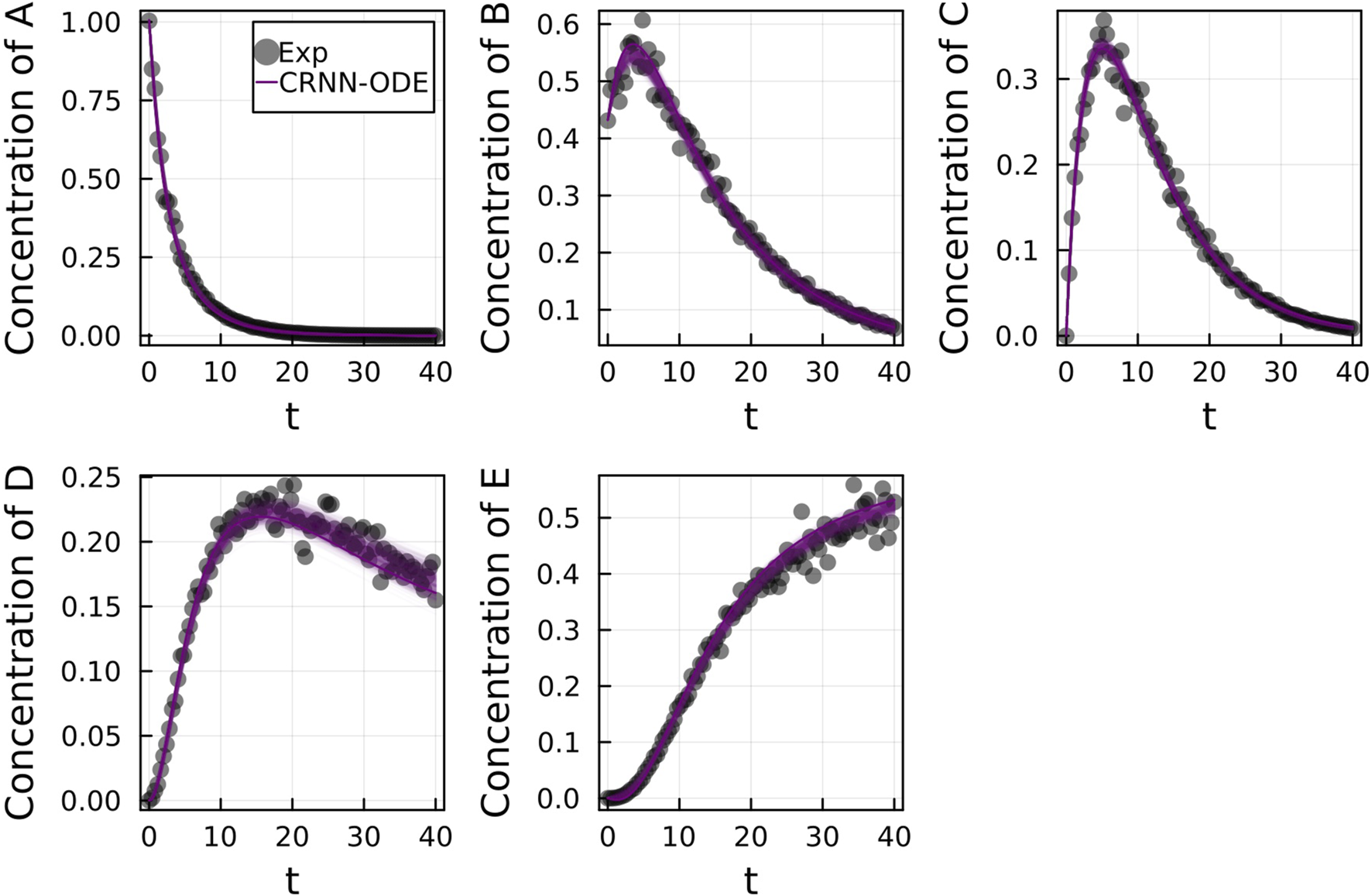 Figure 2 shows the comparison of the Bayesian Neural ODE prediction compared to the data for the species A, B, C, D, and E in the four reaction system described in Case 1. A total of 500 posterior sample prediction are superimposed on the data; and a good agreement is seen between all trajectories and the data.