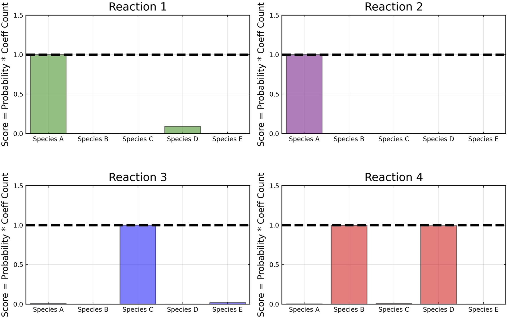 Recovered score metric for each of the four reactions shown in case 1. Score metrics are calculated using Equation 6 and represent the weighted probability that a species is a reactant of each reaction. No noise was added to the data.