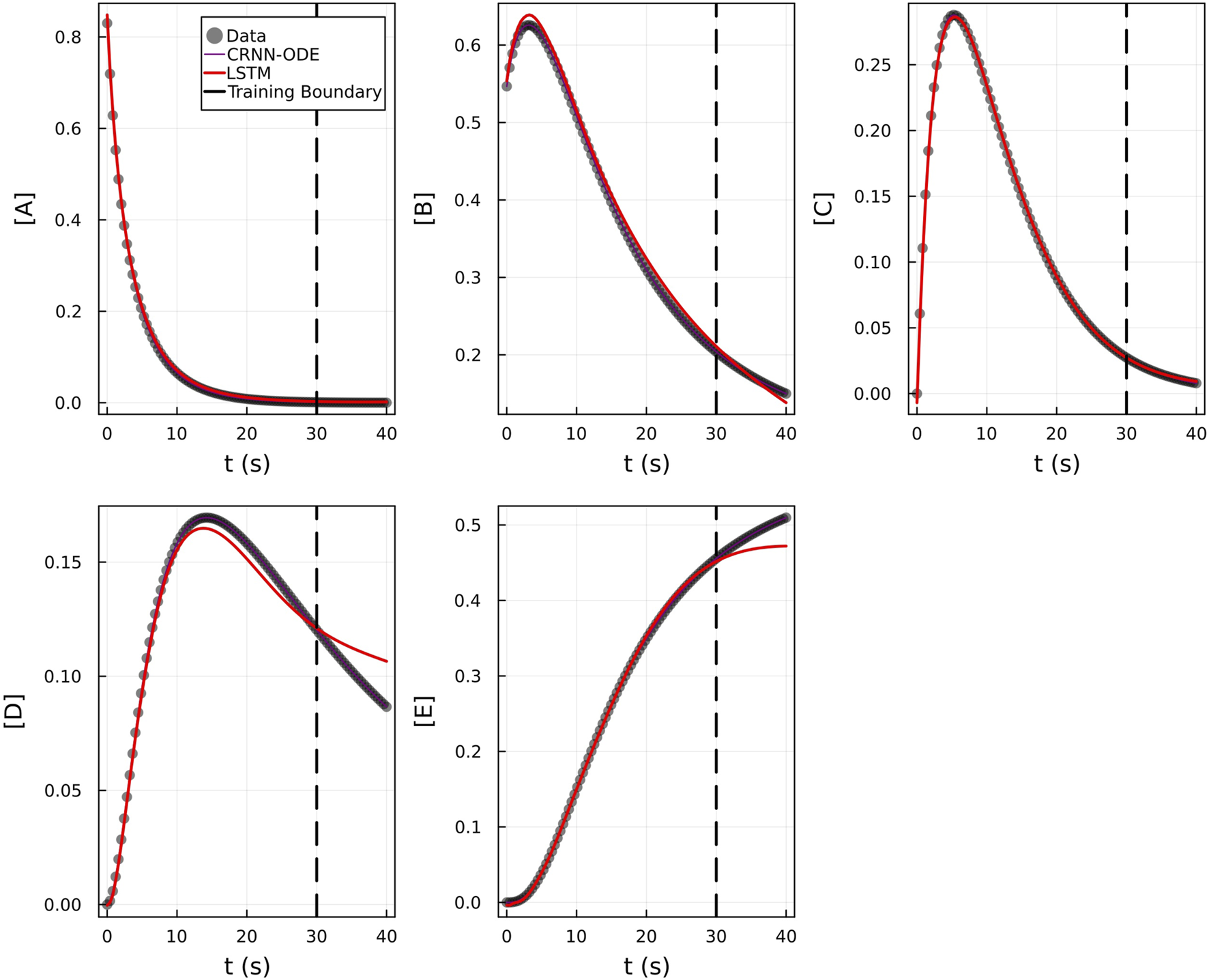 Comparison of LSTM model with Bayesian CRNN (chemical reaction neural network) for chemical species (A–E). Only time points 0–30 were used for training as depicted by the training boundary. Time points 30–40 were used for comparison of the accuracy of extrapolation beyond training time points.