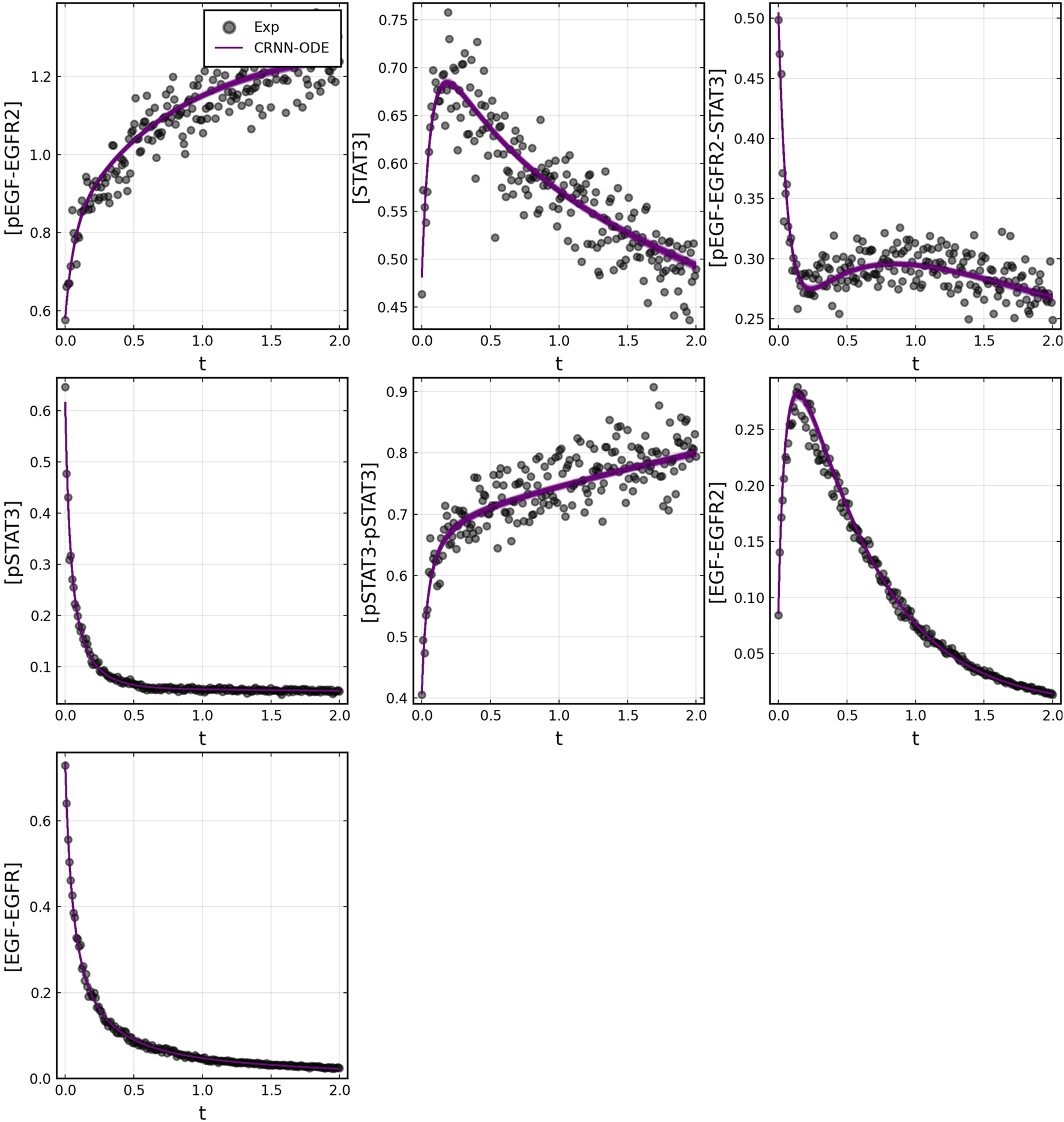 To further test the capabilities of the Bayesian CRNN, we attempted to recover the reaction network governing the EGFR- STAT3 signaling pathway Bidkhori et al. (2012). Our simplified representation of this pathway consists of seven chemical species and six reactions listed in Table 2. Here we omit the reverse reactions because they cannot be identified from the forward reactions with this framework.