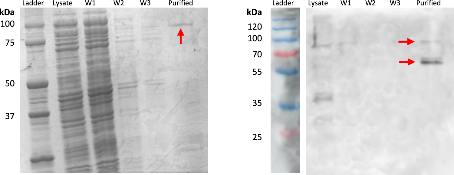 SDS-PAGE and Western blot highlighting INP-silicatein-α expression. SDS-PAGE for INP-silicatein-α purification with cell lysate, wash 1 (W1), wash 2 (W2), wash 3 (W3), and purified fractions. Western blot shows lysate, W1, W2, W3, and purified fractions. Red arrows indicate bands consistent with anticipated molecular weight of INP-silicatein-α (51.5 kDa) and INP-silicatein-α dimer (103 kDa).