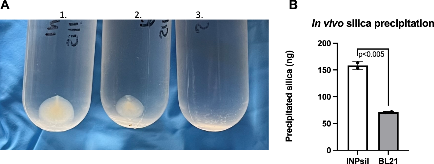 In vivo biomineralization with INP-silicatein-α. Silica mineralization can be visualized as precipitate after sample ultra-centrifugation. (A) 1) Precipitate from E. coli INP-silicatein-α and sodium orthosilicate after 24-h incubation, 2) precipitate from WT BL21 E. coli and sodium orthosilicate after 24-h incubation, 3) precipitate from sodium orthosilicate alone after 24-h incubation. (B) Comparison of precipitated silica (ng) as quantified via silicomolybdate assay. Two-tailed unpaired t-test (p < 0.005).