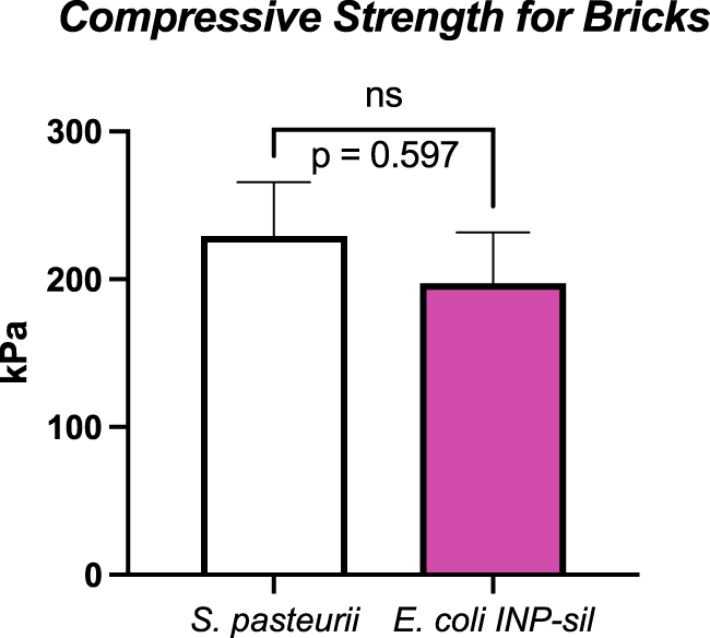 Unconfined compressive strengths for S. pasteurii and E. coli INP-silicatein-α bricks. S. pasteurii bricks show an average tolerance to 229 kPa (S.E.M. 36 kPa). E. coli INP-silicatein-α bricks show an average tolerance of 197 kPa (S.E.M. 34 kPa). A two-tailed unpaired t-test shows no significant difference between the two (p = 0.597).