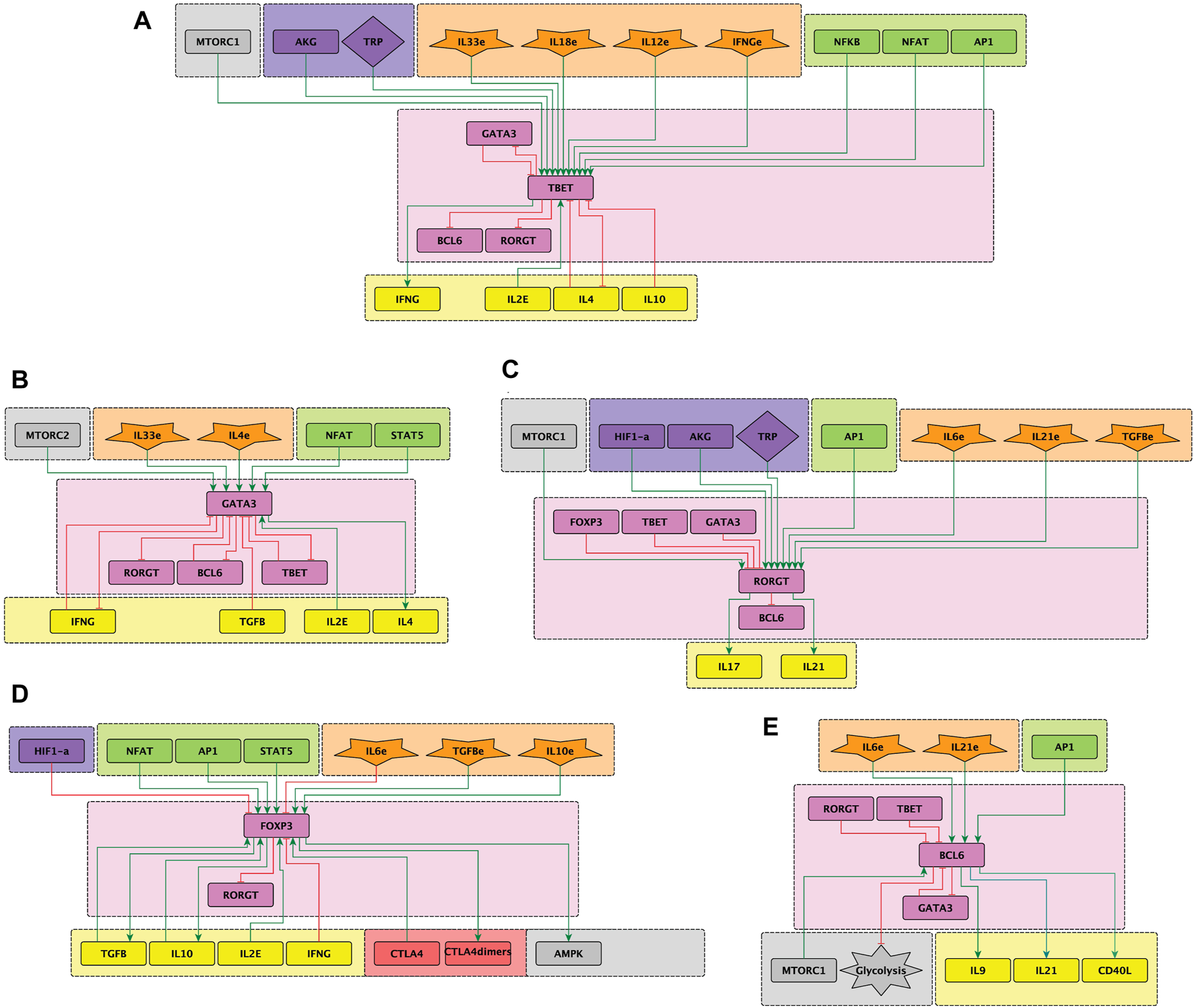 Sub-networks representing the effect of exogenous cytokines (orange) and signaling from transcription factors and metabolism elements (green and grey) on the activity of the lineage-defining transcription factors (LTF’s) (pink) leading to differentiaton of CD4 T cells towards effector phenotypes. (A) T-bet, (B) GATA3, (C) RORt, (D) Foxp3, (E) Bcl-6. Exogenous cytokines induce the activity of LTF’s, which tightly regulate each other (T-bet, GATA3, RORt, Foxp3 and BCL-6) (pink), and guide cell differentiation towards effector cell subtypes (Th1, Th2, TH17, Treg and , respectively). Cytokines produced by differentiated cells are indicated (yellow). Nutrients and oxygen levels (violet) can directly modulate the activity of LTF’s or alter the metabolic equilibrium of lymphocytes, strongly influencing cell differentiation.