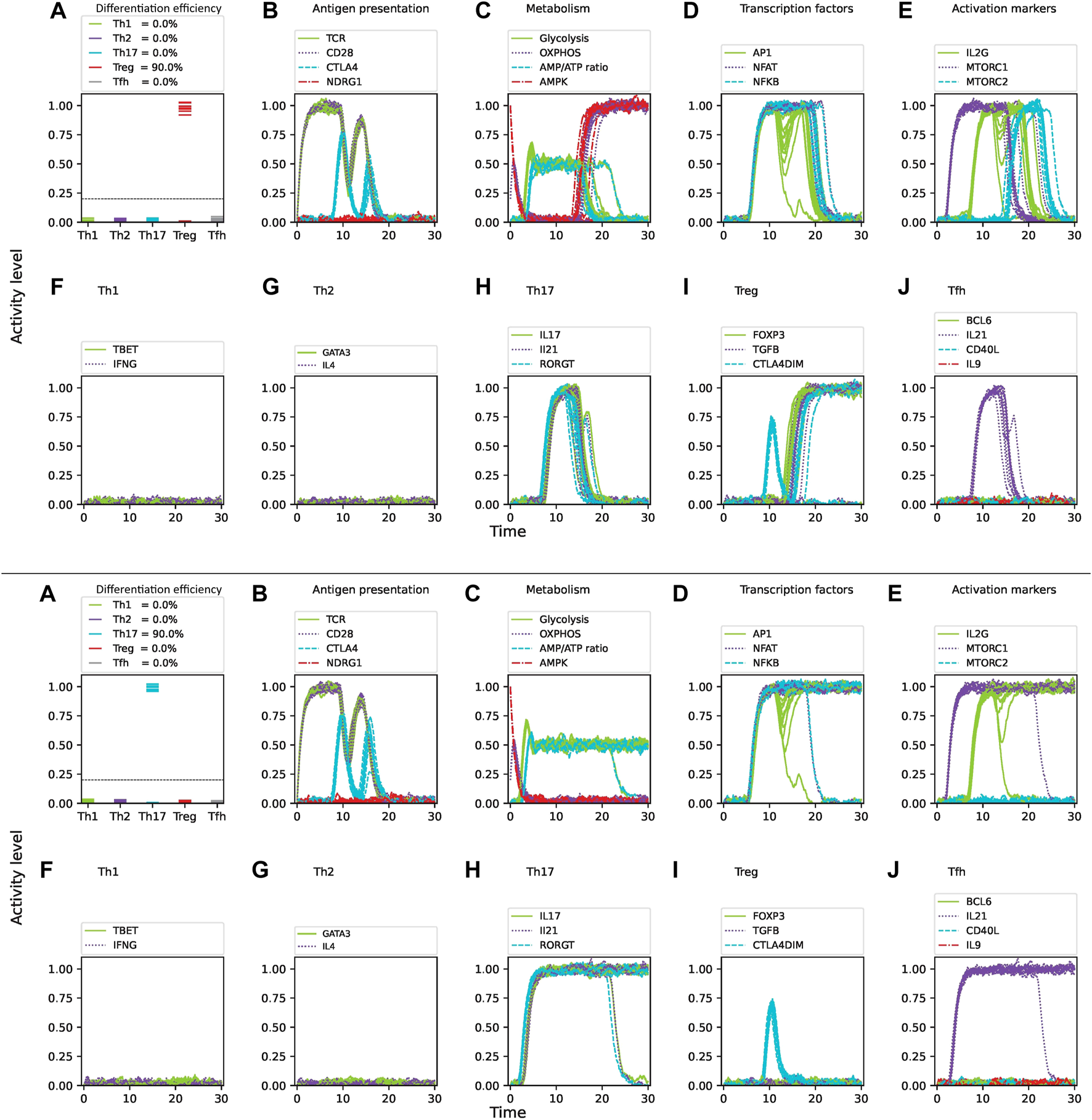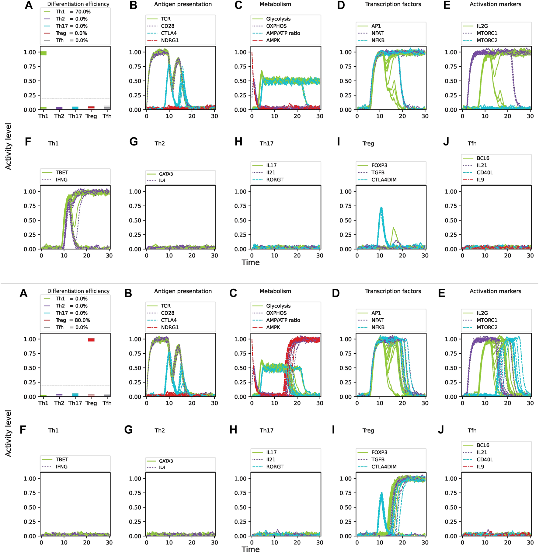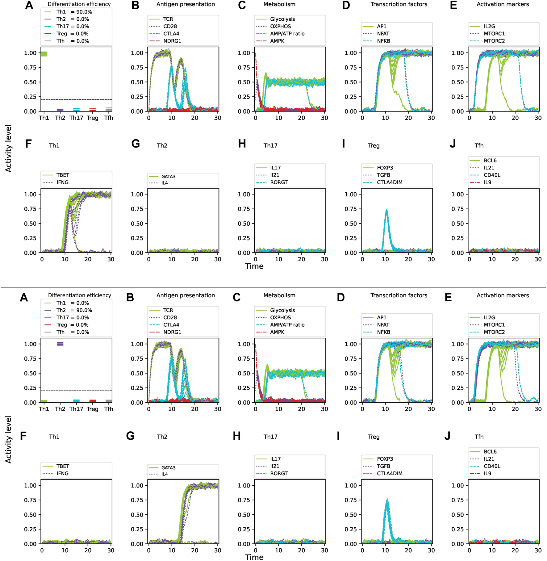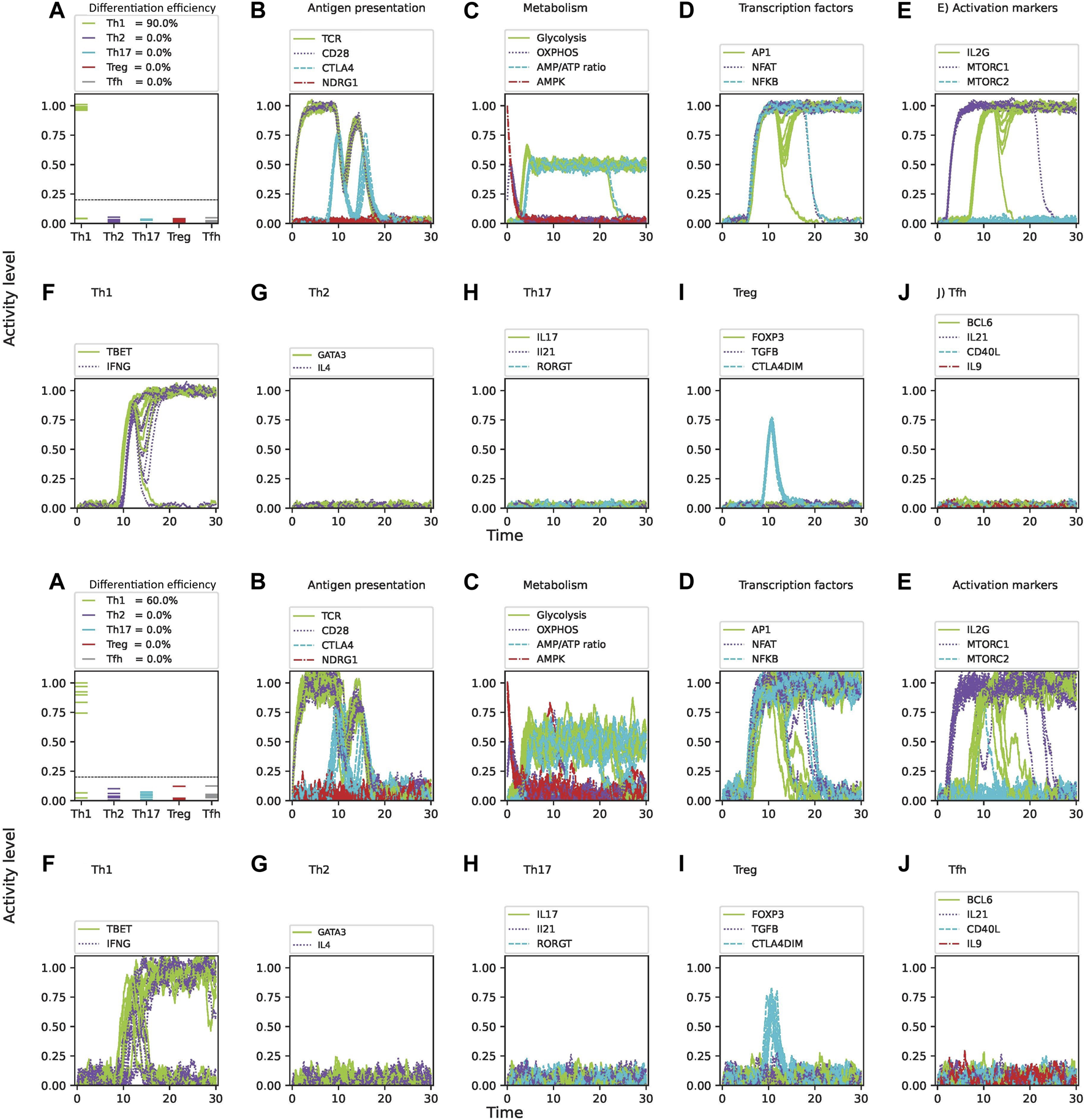 Intrinsic noise significantly affects the differentiation efficiency of CD4 T cells under optimal levels of Th1-inducing cytokines (IFN-, IL-12, IL-18, IL-33), nutrients (glutamine, tryptophan), and oxygen availability. Upper panel: 3 noise. Lower panel: 10 noise. (A) Fraction of differentiated cells expressed as the level of activity of lineage-defining transcription factors at 30 units of time after T cell activation (TCR stimulation and CD28 costimulation). The dotted horizontal line represents a threshold of activation level where activation levels below the value 0.2 are considered as not differentiated. (B–E) Activity levels of key molecules and pathways involved in CD4 T cell activation and differentiation: (B) antigen presentation and regulatory elements, (C) metabolism, (D) transcription factors, (E) activation markers. (F–J) Activity of T cell lineage-defining transcription factors and production of specific cytokines over time.