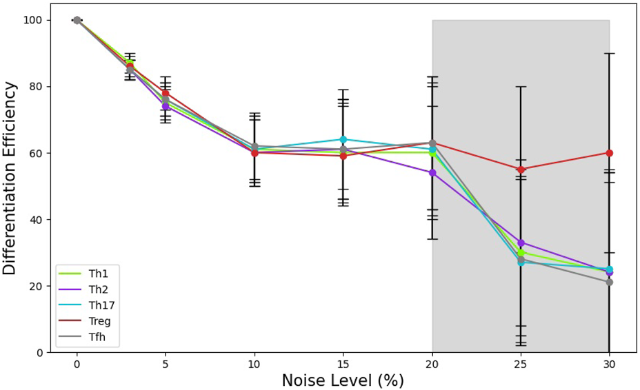 In Figure 5 we present the changes induced by different noise levels on the T cell differentiation efficiency under a specific cytokine microenvironment: Th1, Th2, Th17, Tref or . For relatively small noise levels, , we observe that decreases linearly with increasing noise, down to a value . Notably, enhancing noise levels between 10 and 20, do not induce a further decrement of , but this parameter shows a plateau at such value. Afterwards, increasing noise levels with values , causes a drastic reduction of the differentiation efficiency for all considered phenotypes, except for Treg. Thus, a level of noise around 20 can be interpreted as a threshold beyond which most of the specific phenotype expression is significantly reduced.