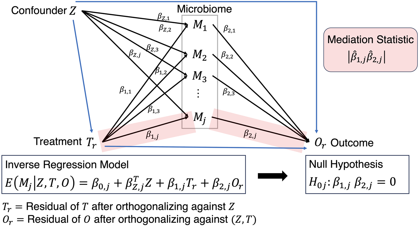 Although still in its infancy, a recently proposed framework (Yue and Hu, 2022), simultaneously links Treatment , microbial mediators , outcome , and confounding covariates . The classical model for multiple mediators (Van Der weele & Vansteelandt, 2013) is a double regression problem, where for a continuous outcome and mediators, we havewhere the total mediation effect through microbial mediators take the form with characterizing the effect of on given , and characterizes the effect of on given and and all other s. Testing for an individual mediator achieves the purpose as the non-zero value indicates the contribution of to the overall mediation effect. called forward outcome model is difficult to solve as there are more mediators than the number of samples, and therefore an inverse regression model is proposed (Figure 3) where orthogonalized versions of the residual of treatment against defined as , and orthogonalized versions of the residual of against defined as are used, and the two equations are merged into a single equation,such that corresponds to , and corresponds to with the test becoming for an individual mediator.