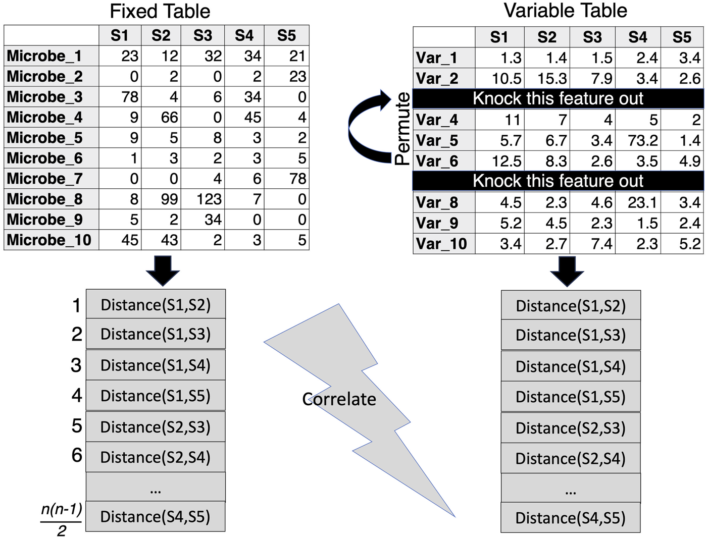 BIOENV approach, where the similarity distance is calculated for a fixed matrix (microbiome) and the features in the variable table are permuted to calculate a variable similarity distance in such a way that those subsets are retained where the correlation between the distances of the two matrices is optimized.
