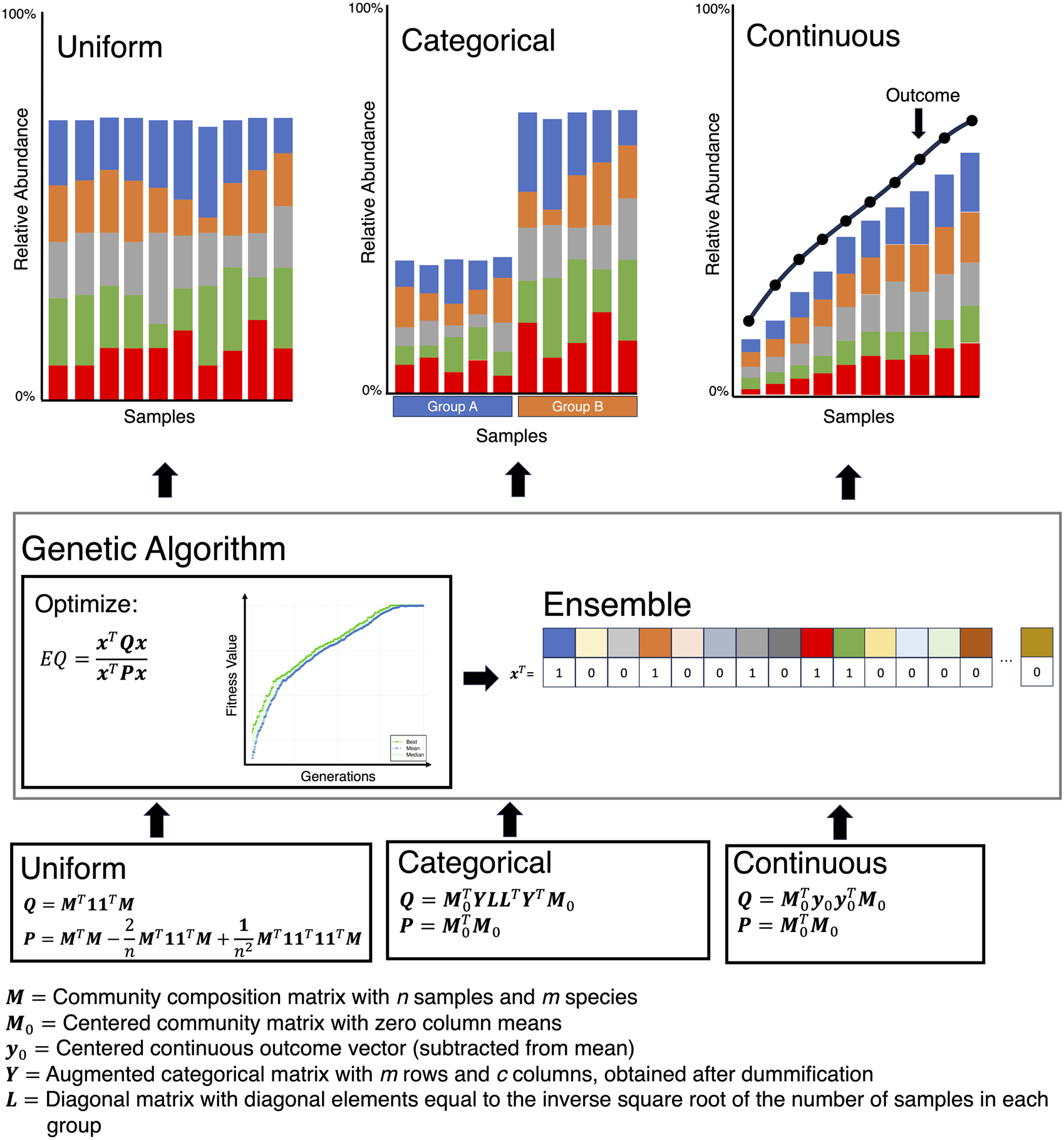 The Ensemble Quotient optimization algorithm works by finding an ensemble (a subset of microbes) that either remains stable (Uniform), has a stratified response (Categorical), or correlates with a covariate of interest (Continuous).