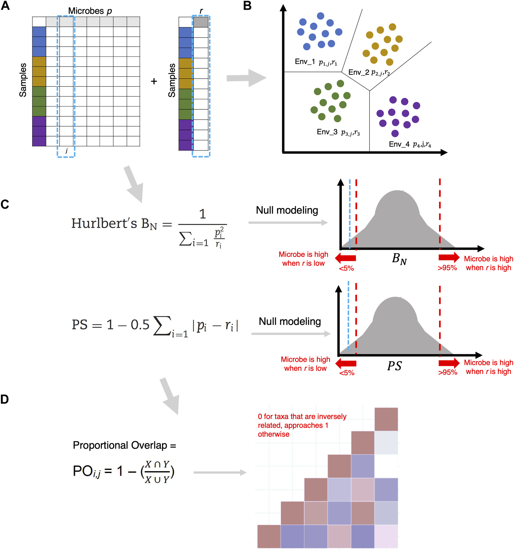 (A) Given , the proportional abundance of a microbe in the -th environment, an environmental property (continuous covariate) is associated with each environment. (B) In the total number of environments being (stratification based on some commonality among samples), we can assume for , and to be fairly stable within the environment and vary more across the environments. (C) Hurlbert’s and Feinsinger’s PS statistic indicates a negative or positive relationship between a microbe and an environmental property. A null modeling procedure is considered by generating a random normal distribution with 999 possible estimates, and by labeling a microbe as “negative” if the metric <fifth Quantile, and “positive”, if the metric >95th Quantile. (D) For Proportional Overlap , X (for microbe i) and Y (for microbe j) are Feinsinger’s PS.