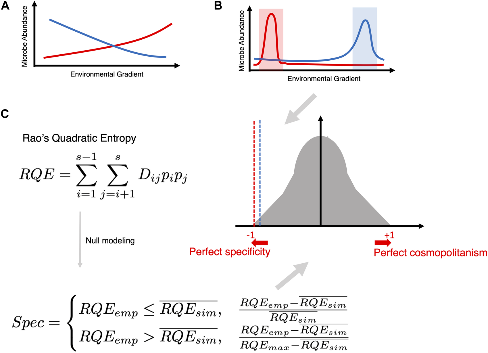 (A) Traditional way of finding an association (whether negative or positive) between microbial abundance and a continuous covariate of interest. (B) The goal of specificity analysis is to find microbes that become specific within a narrow range of a covariate of interest. (C) Creating a null distribution utilizing Rao’s Quadratic Entropy formula (which incorporates the difference of the covariate across two samples and as , multiplied by the relative abundance of the microbe across two samples as and ). These are calculated for all pairwise combinations of samples (). The empirical value is then compared with the average of the 999 null distribution values to tag a microbe as specific (Spec ∼ −1) or cosmopolitan (Spec ∼ +1).