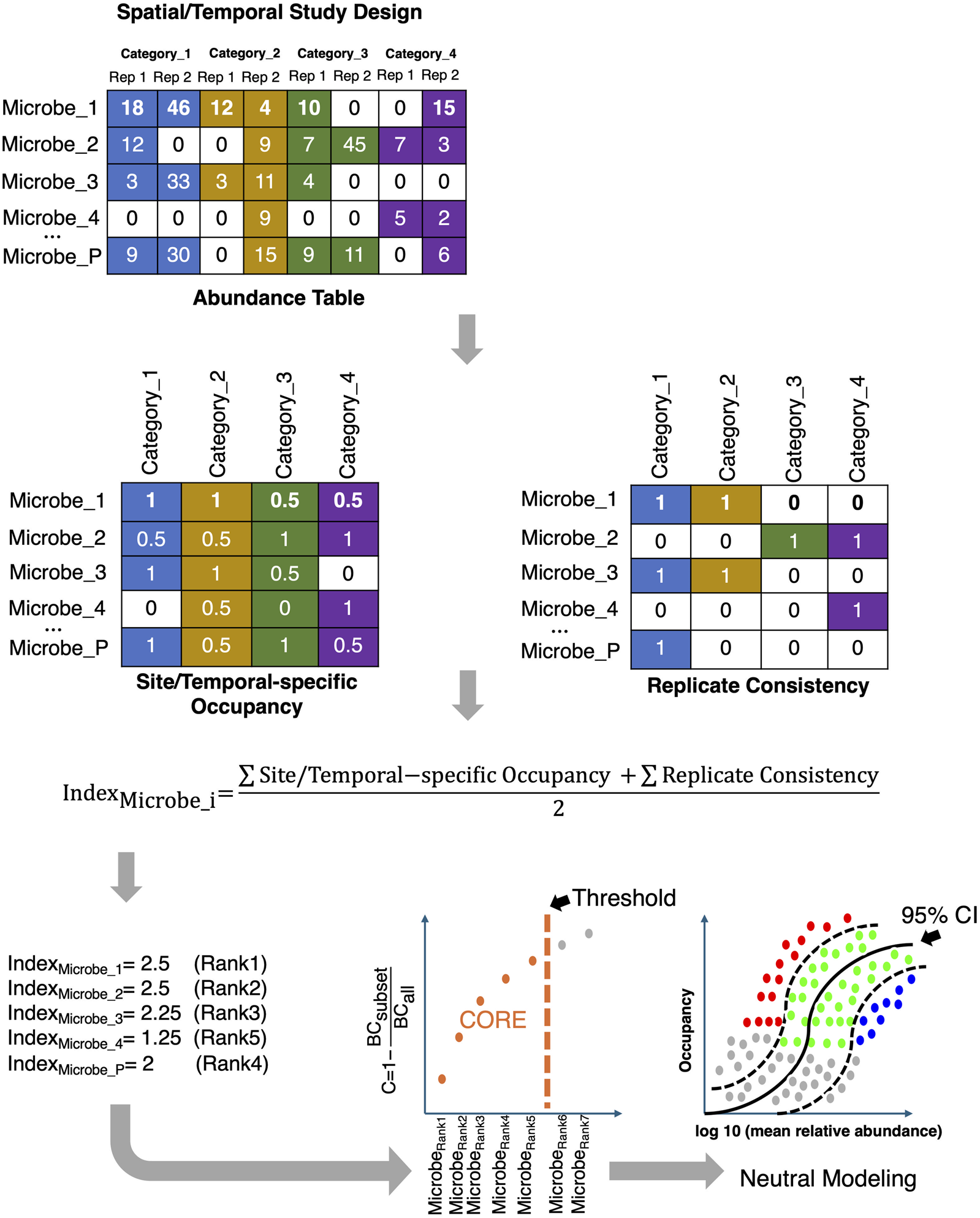The core microbiome is established by first ranking the microbes based on a combination of two criteria, Site-specific Occupancy and Replicate Consistency, and then using the Bray-Curtis (BC) contribution of the core subset to the whole community; the core subset is iteratively constructed until the stopping criteria are reached. The core subset is then further discretized to those that: fall above the neutral model (selected by host/environment and represented by red dots in the bottom right figure); fall below the neutral model (selected by dispersal limitation and represented by blue dots); and those that fit the 95% CI of the neutral model (represented by green dots).